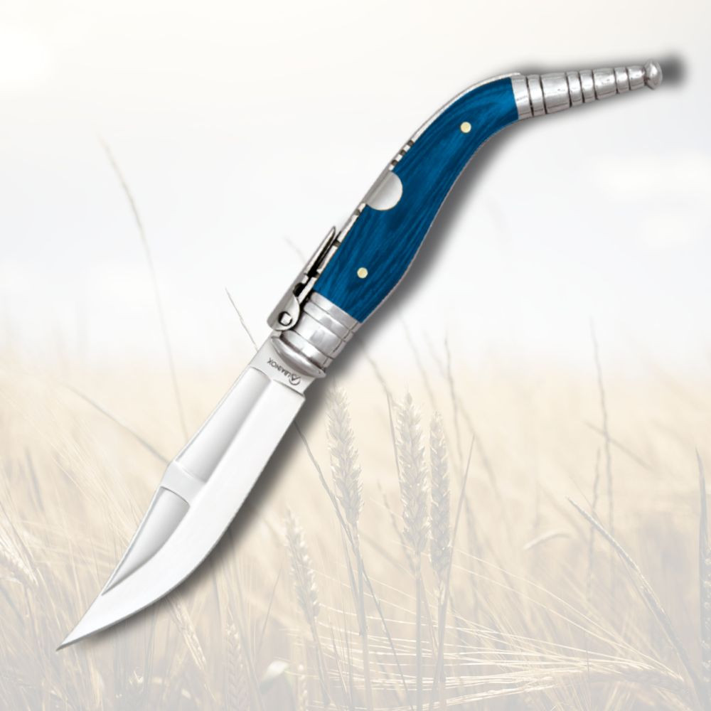 Su hoja, fabricada en acero 3CR13MOV de alta calidad, garantiza durabilidad y resistencia, asegurando que siempre esté lista para el desafío. A través de un diseño ergonómico, el mango de Stamina azul ofrece un agarre cómodo y seguro, permitiéndote maniobrar con facilidad. Se presenta como un accesorio versátil y atractivo que eleva tu equipamiento personal.