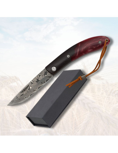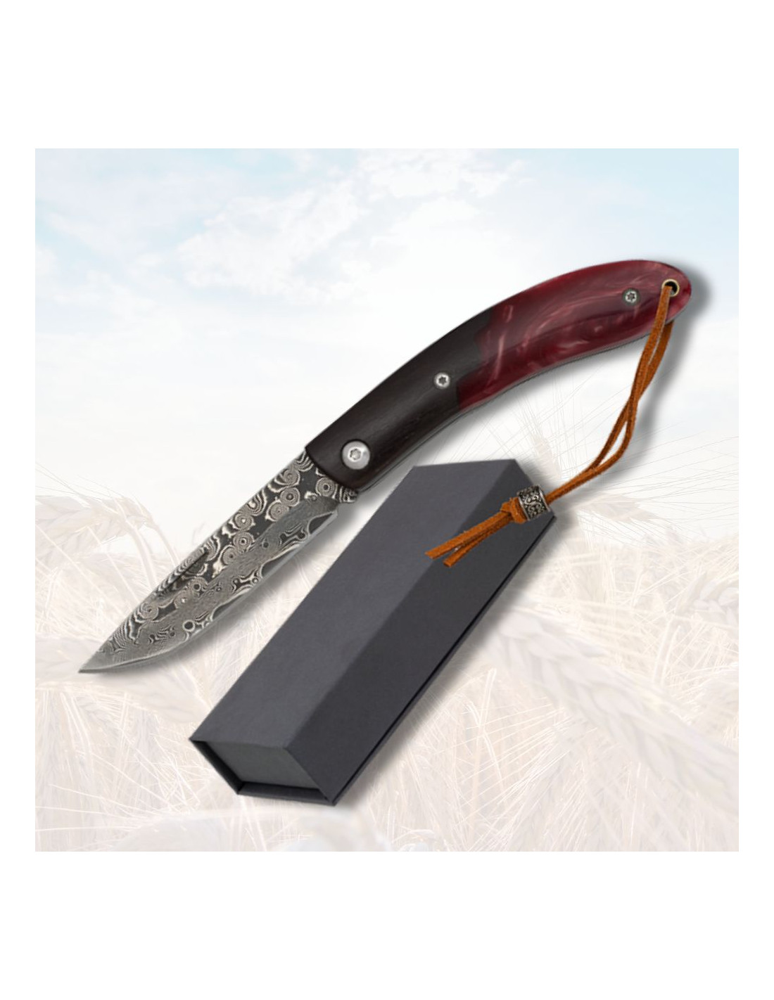 Gracias a su diseño con un solo filo, esta navaja es perfecta para tareas precisas y manejo cómodo en actividades al aire libre o coleccionismo. El acero damasco no solo aporta durabilidad y resistencia, sino que también le confiere ese aspecto distintivo y refinado que encanta a quienes aprecian la belleza en cada detalle.