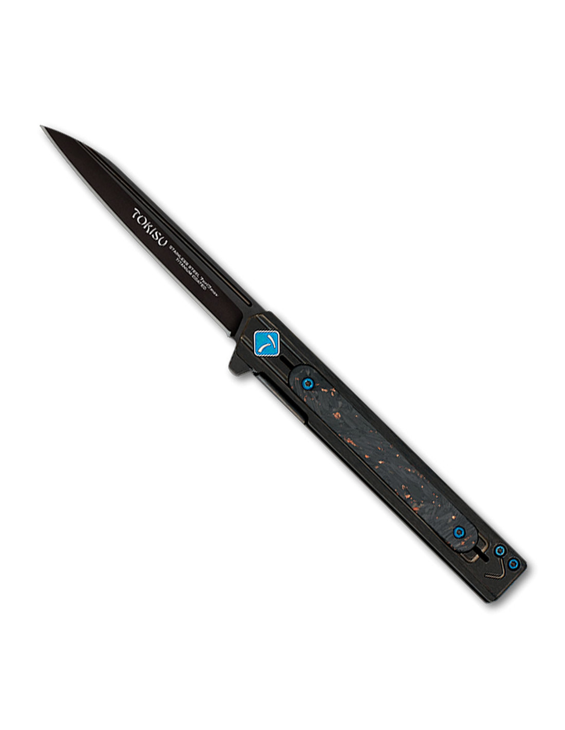 El mango, recubierto de titanio negro con fibra de carbono, combina ligereza y agarre firme gracias a su textura antideslizante. Los detalles en azul de los tornillos aportan un toque de estilo distintivo, haciendo que esta navaja sea mucho más que una herramienta, ¡es una declaración de gustos refinados!