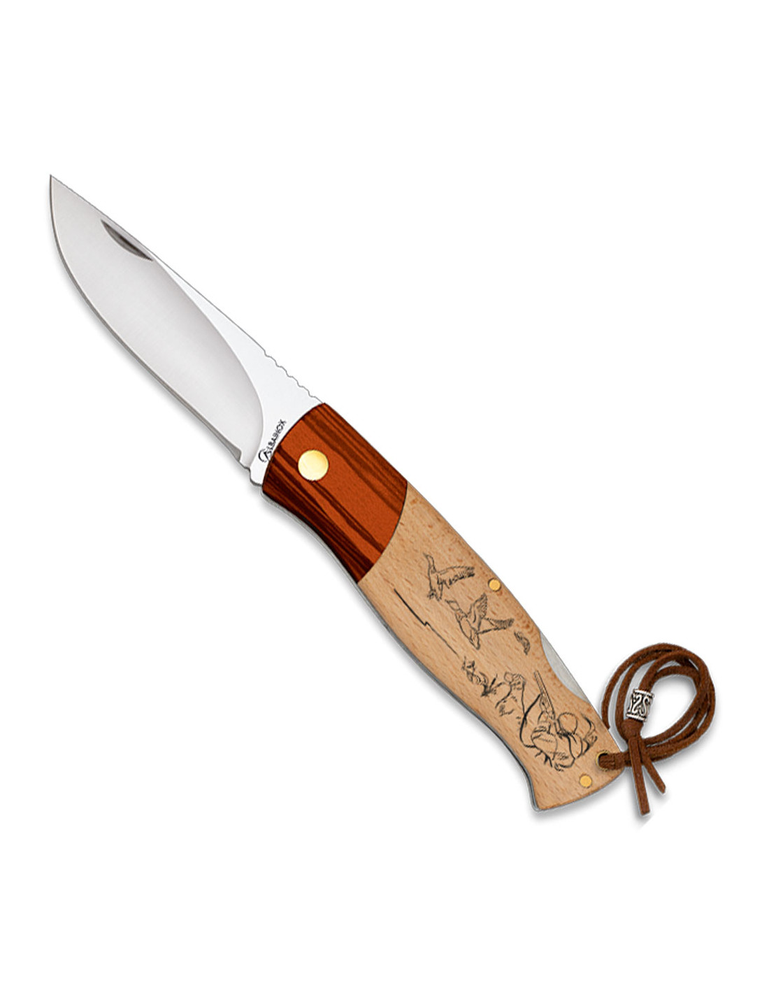 El mango, elaborado en madera natural con tonos claros y oscuros, proporciona un agarre cómodo y seguro, complementado por remaches dorados que realzan su aspecto sofisticado. La cuerda de cuero en el extremo del mango permite colgarlo o asegurarlo fácilmente, aumentando su versatilidad en campo.