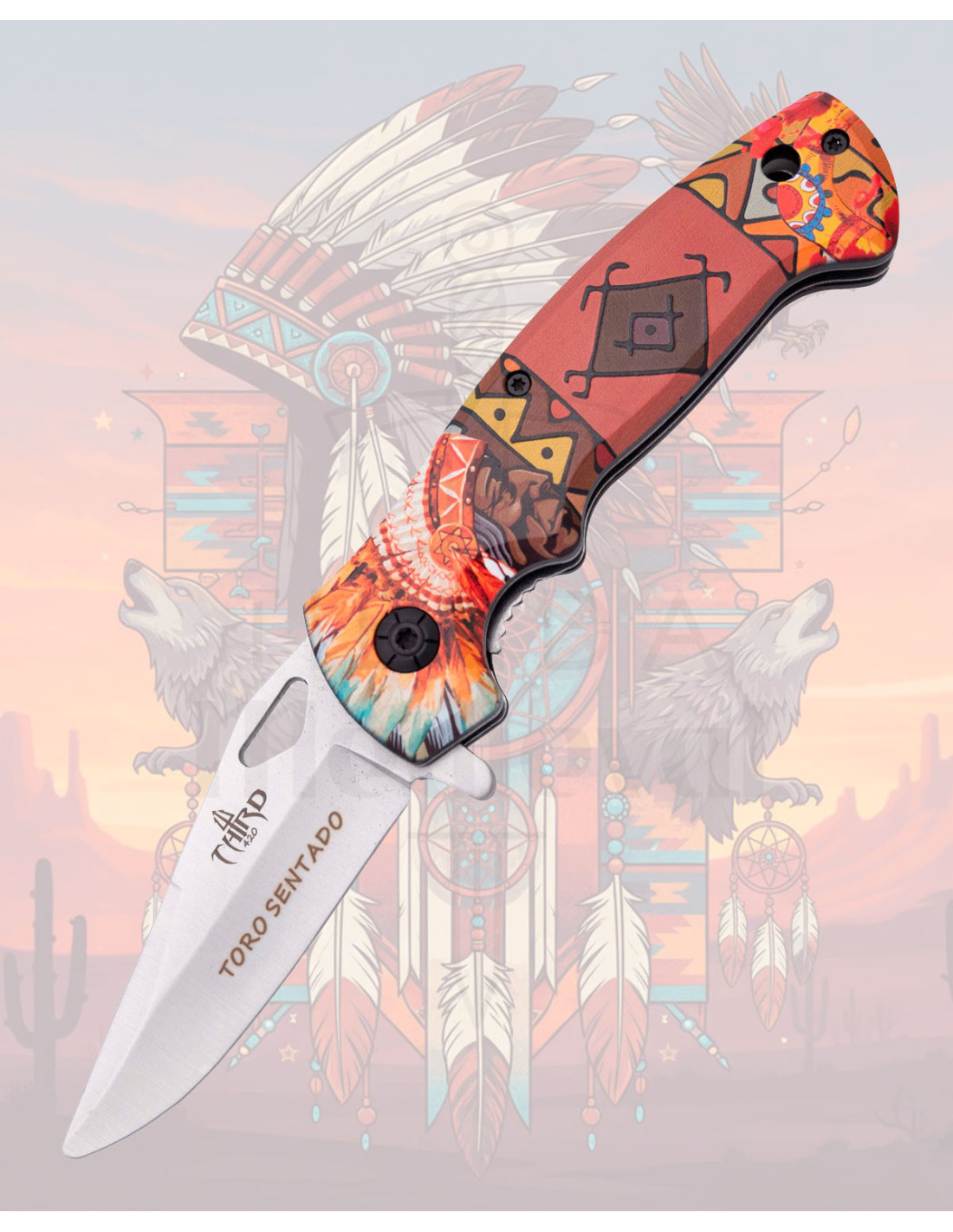El mango ergonómico ofrece un agarre cómodo y seguro, con hendiduras que guían los dedos de forma natural, lo que se traduce en control y confianza en cada manejo. Su decoración en relieve con la figura de un indio con penacho, en tonos cálidos y toques azules, aporta carácter y convierte la navaja en un objeto para mostrar con orgullo.