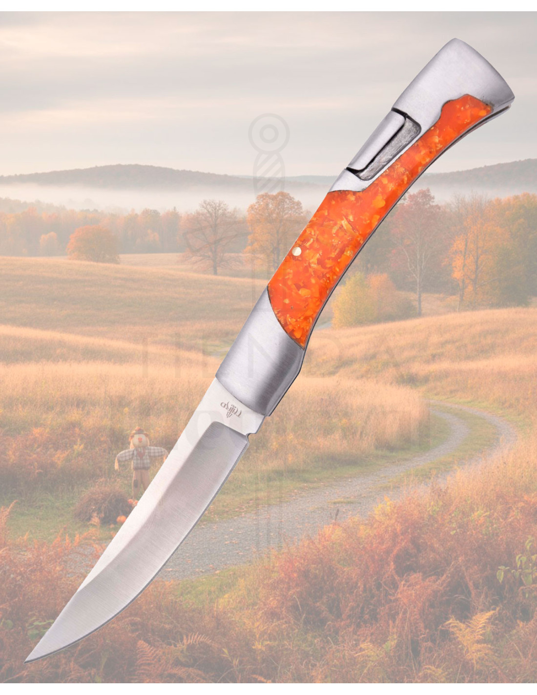 El mango combina acero y una inserción de acrílico naranja fluorescente con vetas marmoleadas, convirtiéndolo en una pieza fácil de ubicar incluso con poca luz. Su diseño curvado abraza la mano de forma ergonómica, aportando agarre seguro y sensación de control prolongado, mientras las virolas metálicas pulidas refuerzan la durabilidad y el aspecto premium.