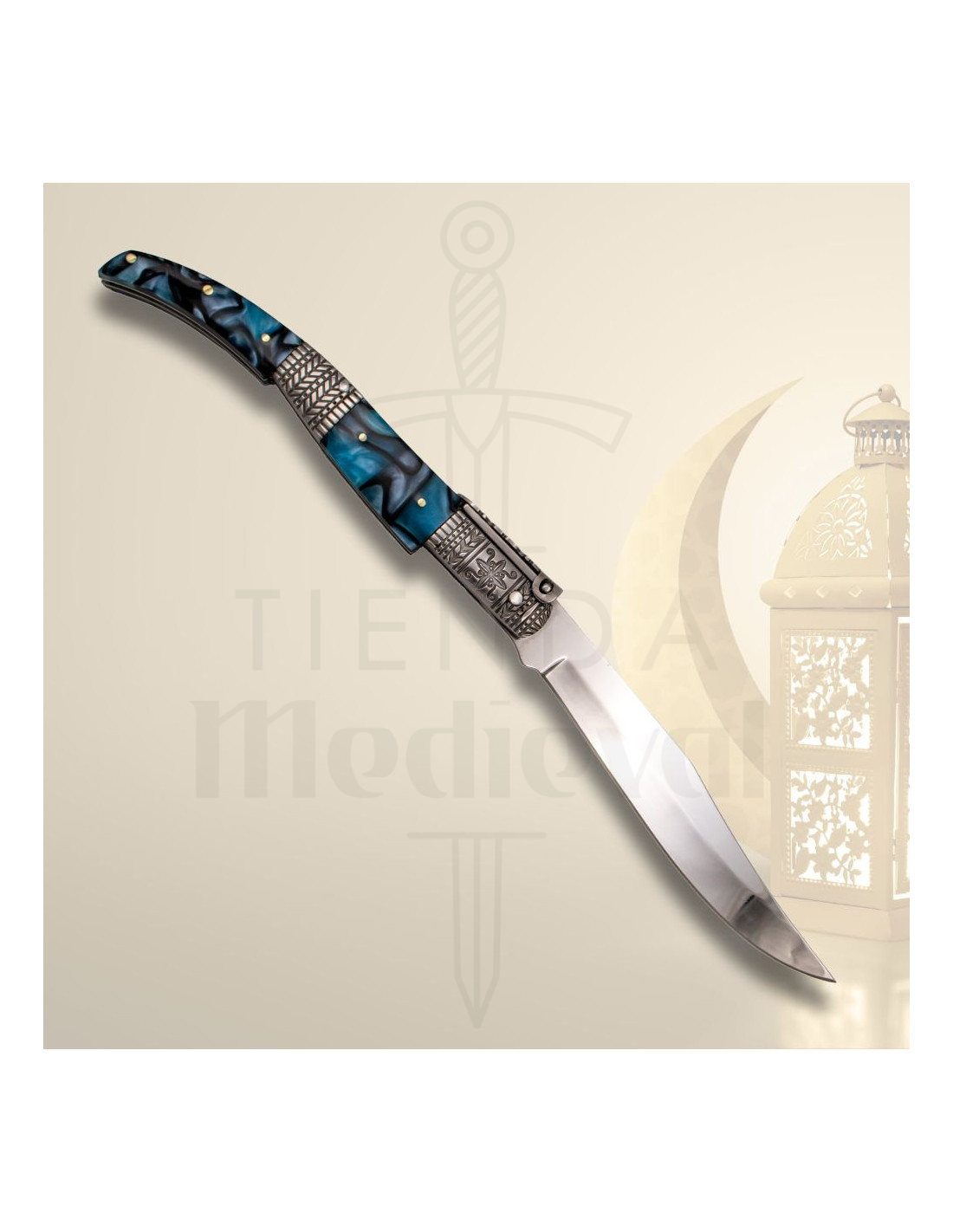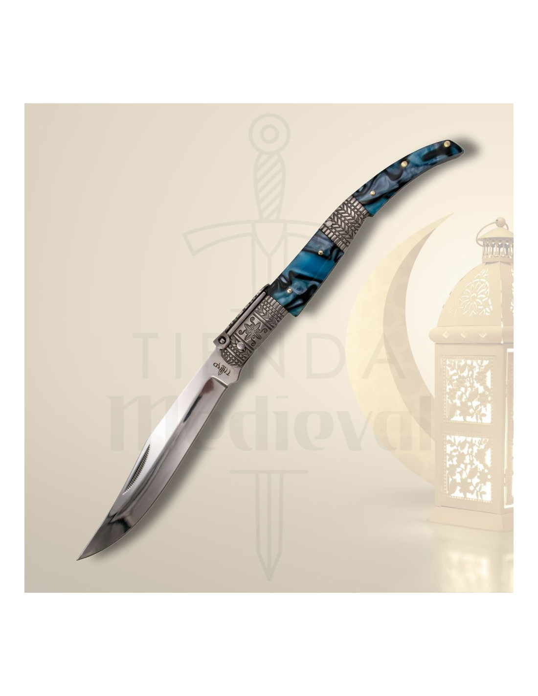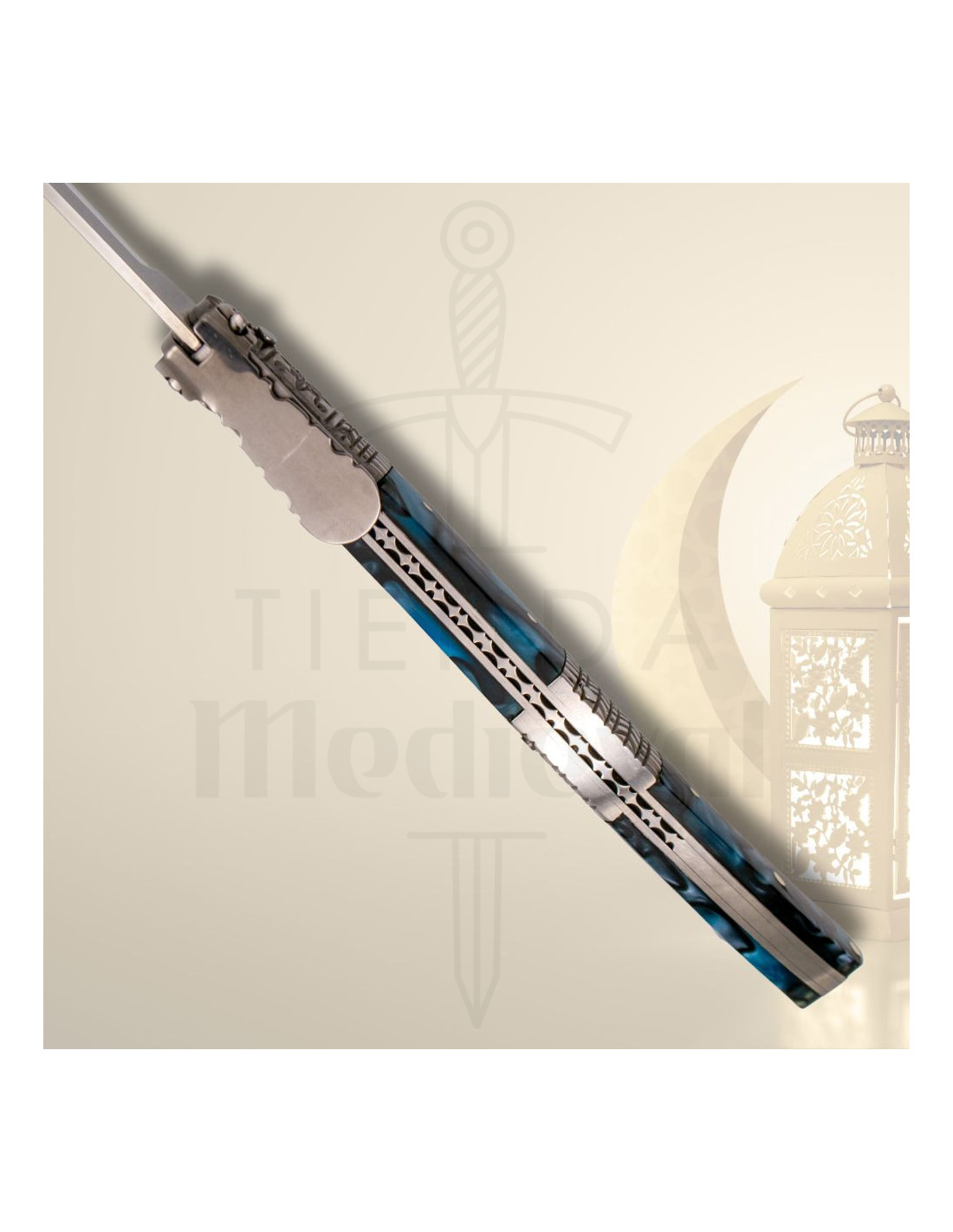Su mango, una fusión de acero inoxidable con inserciones de acrílico azul, está meticulosamente diseñado con un bajo relieve decorativo, inspirado en las navajas clásicas españolas del siglo XIX. Esto no solo garantiza un agarre cómodo y seguro, sino que también convierte cada uso en un auténtico homenaje a la herencia artesanal del pasado.