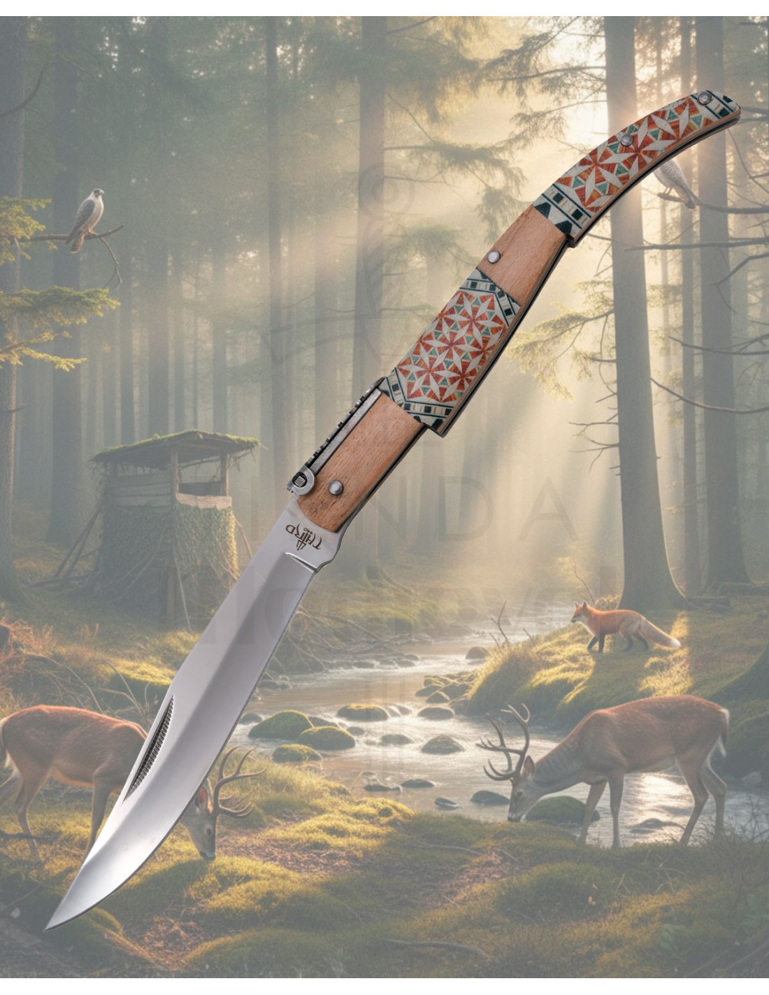 El mango en madera Arce, acabado suavizado y decorado con patrones geométricos en tonos marrones, rojos y beige, ofrece un agarre cómodo y elegante, que destaca tanto por su aspecto ornamental como por su tacto tratado. Los remaches metálicos y la palanquilla decorada transmiten solidez y cuidado en cada detalle, haciendo que usarla sea una experiencia segura y refinada.