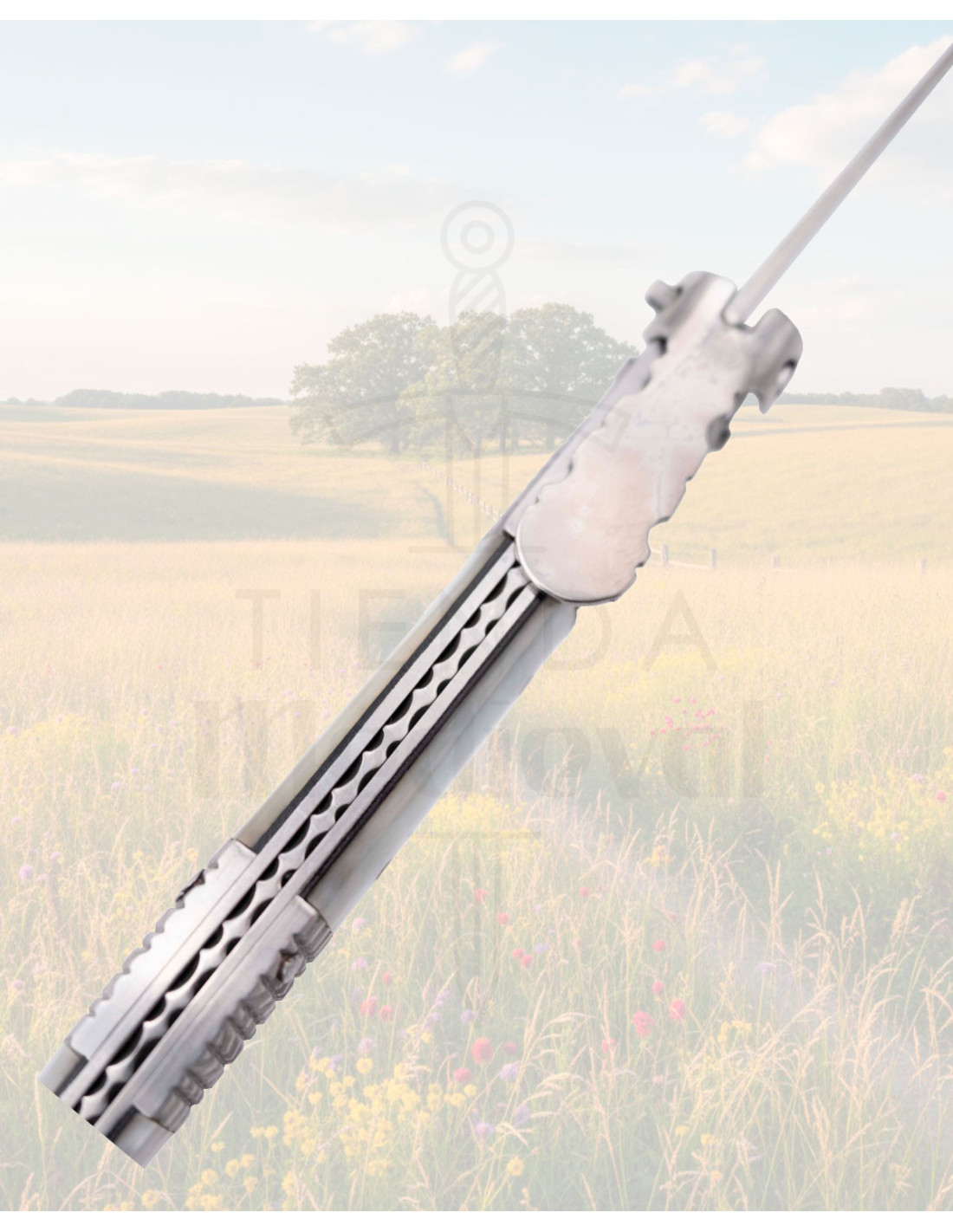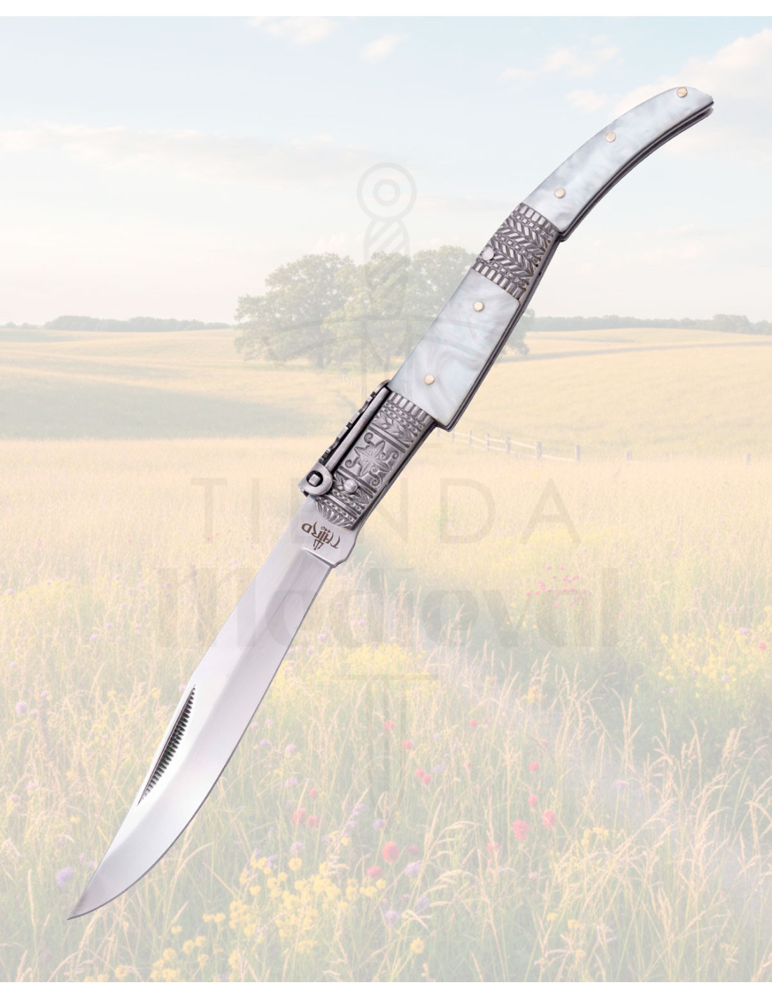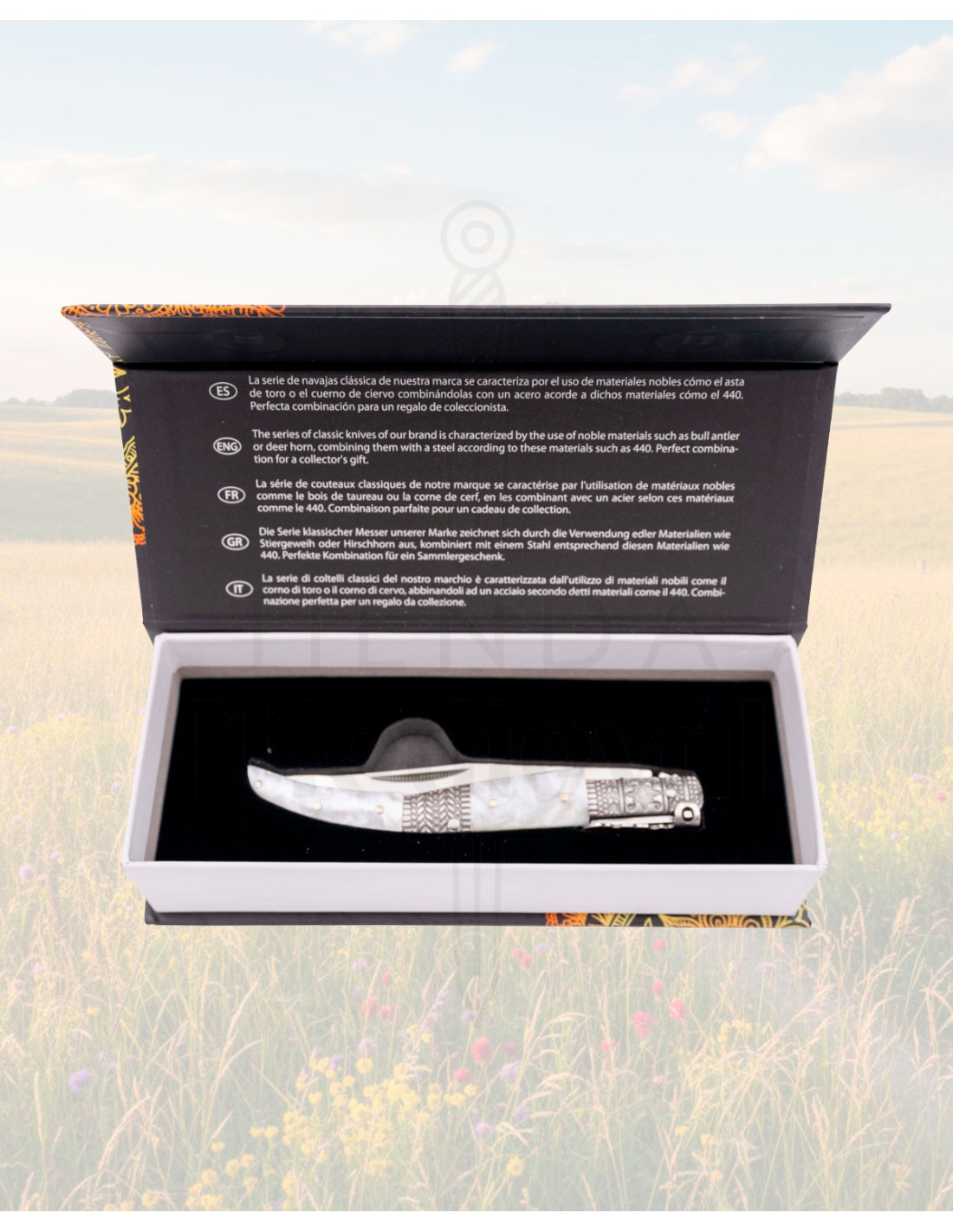 Viene presentada en caja de presentación, lista para entregar o guardar con cuidado. Esa mezcla de tradición y precisión moderna se percibe al tacto, en el brillo de la hoja y en el remate decorativo de cada detalle.