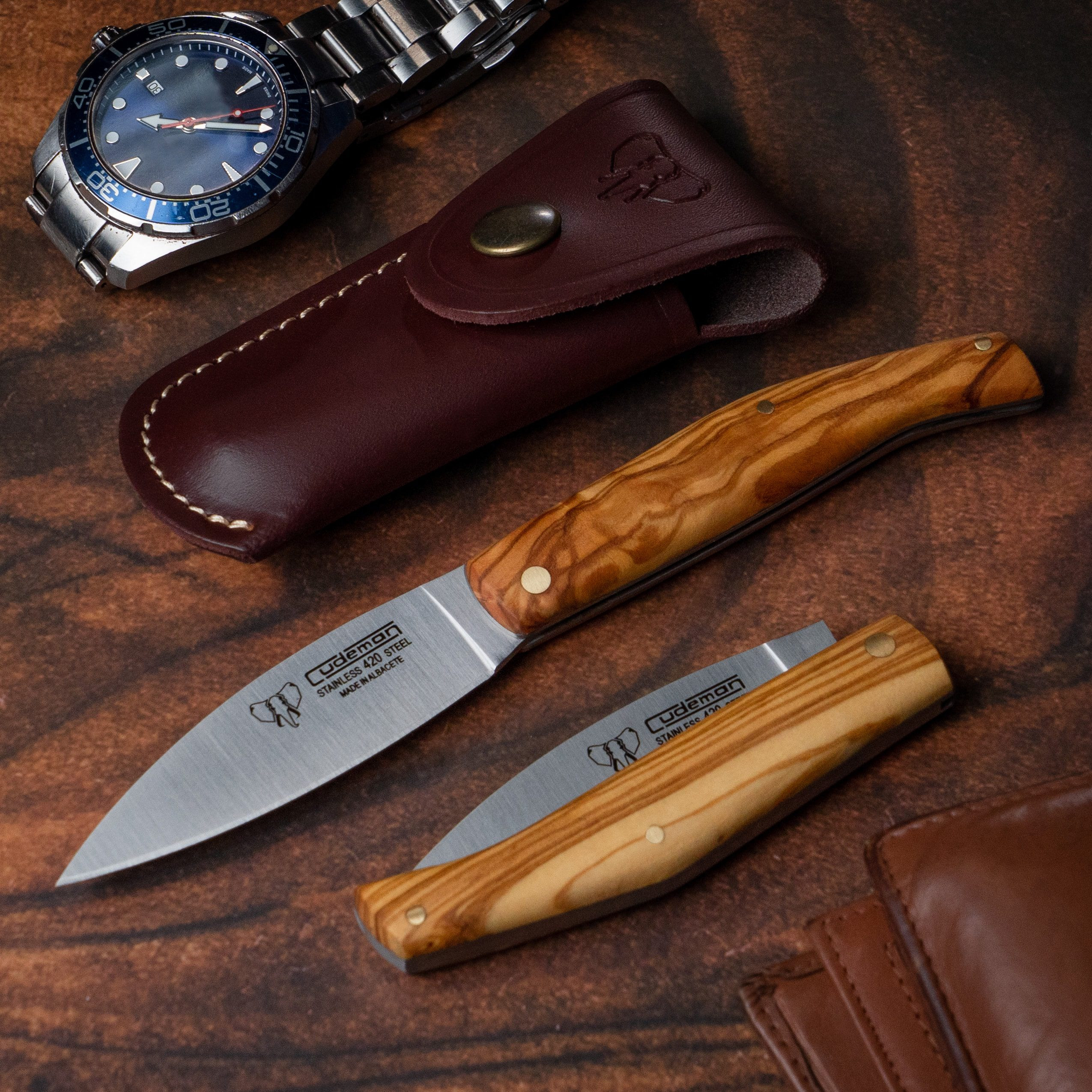 Navaja de caza Cudeman, mango olivo natural satinado (con funda)