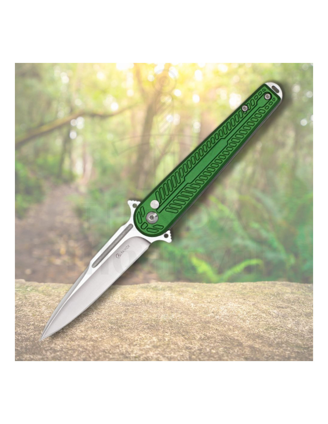 El mango de aluminio en verde no solo aporta un toque moderno y atractivo, sino que también garantiza un agarre seguro y cómodo gracias a su textura cuidadosamente diseñada. Con un clip integrado, podrás llevarla siempre a mano, lista para desplegar en cualquier momento con la rapidez que ofrece su sistema fliper y el sólido bloqueo de pistón, que asegura la hoja en posición para mayor protección.