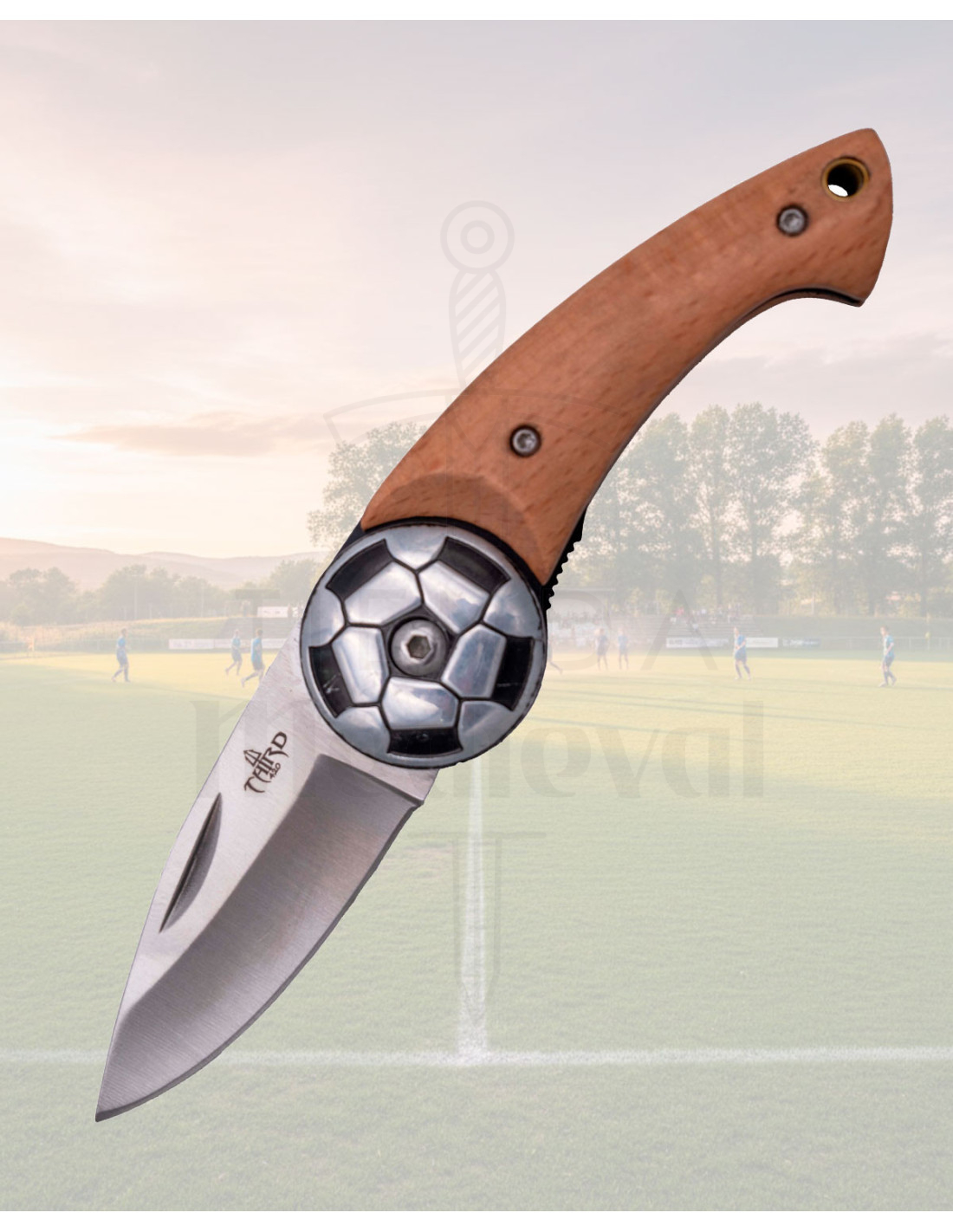 Esta navaja combina diseño y calidez, gracias al mango en madera de haya que ofrece un agarre cómodo y una textura natural que se realza con cada uso. La virola de acero recrea el clásico balón de fútbol, con las superficies plateadas y negras que aportan un detalle decorativo y distintivo, ideal para quien busca algo con personalidad propia.