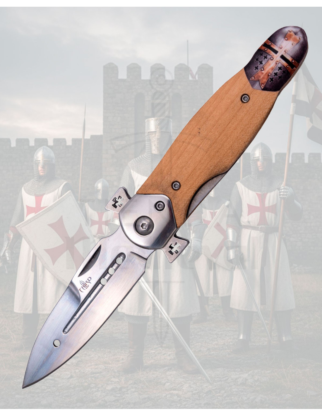 La virola en acero con cruces, pulida hasta lograr un brillo espejo, aporta un punto de distinción que convierte cada uso en una pequeña ceremonia. El mango en madera de haya ofrece una superficie cálida y lisa que se adapta cómodamente a los dedos, mientras la imprimación 3D recrea el casco templario, aportando un relieve táctil que acentúa el agarre sin renunciar a la elegancia.