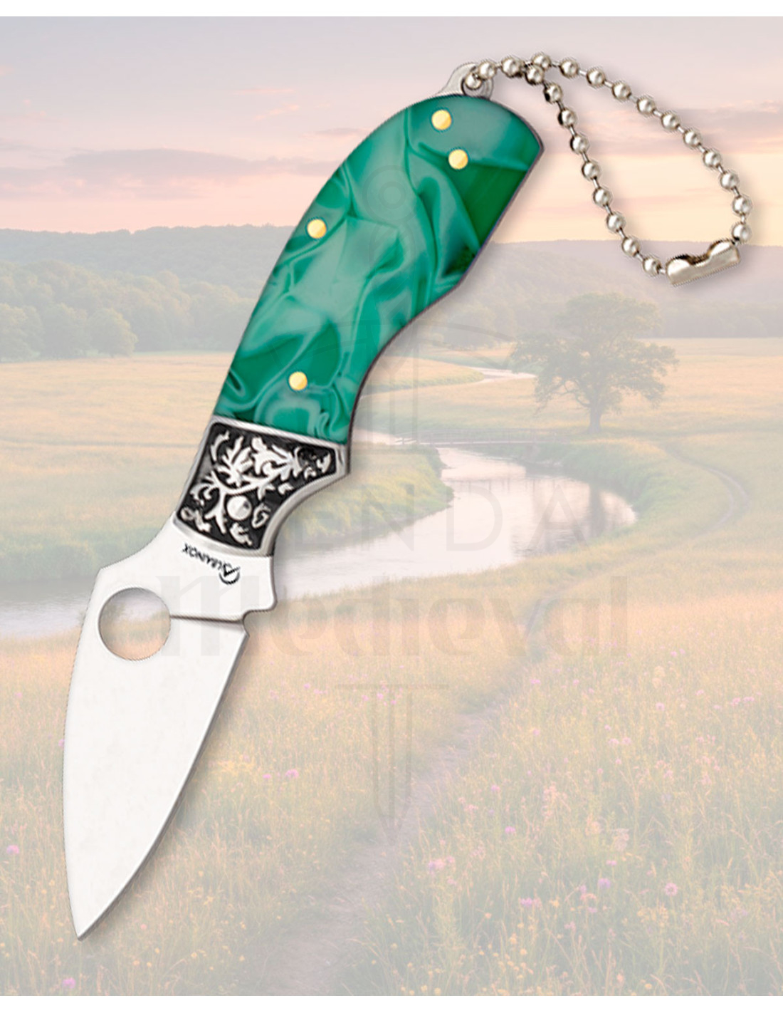 El mango en acrílico verde presenta un patrón jaspeado que la convierte en una pieza distintiva, además de ofrecer un agarre agradable y firme. Los remaches metálicos dorados y la pieza central decorativa en relieve añaden carácter sin sacrificar resistencia, mientras que los forros de acero refuerzan su estructura.