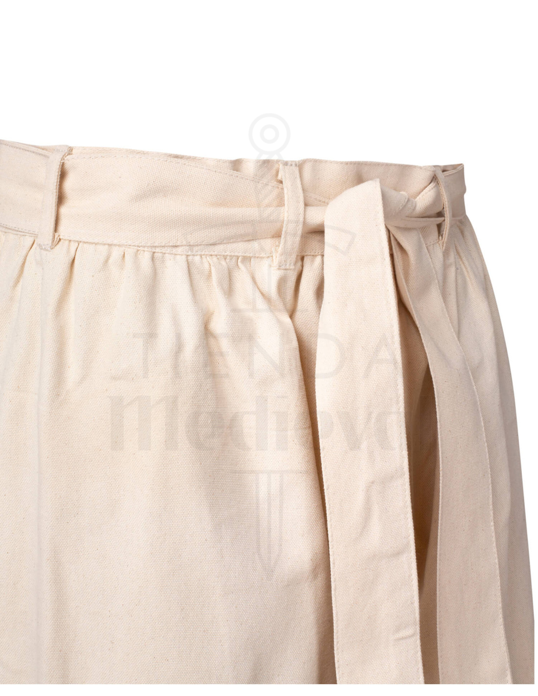 Fabricados en 100% algodón, son suaves y ligeros, garantizando comodidad durante largas horas de uso. La cinturilla con lazo, junto a los lazos en los dobladillos, hace que su ajuste sea sencillo y adaptable a diferentes siluetas, sin perder ese estilo relajado y funcional. Además, los cinturones con aros permiten agregar un toque más personal o práctico. La confección con pliegues en la parte superior y en los puños proporciona un acabado que respeta la estética histórica y facilita combinarlos con grebas, leg wraps o botas altas, manteniendo el carácter de la vestimenta vikinga.