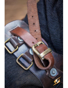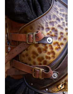 Protege tu torso y abdomen con el Peto y espaldar del Orco Asaltante, ideal para el LARP. Esta pieza de armadura gastada y resistente está diseñada para brindarte la máxima protección en tus aventuras. Consta de un peto sólido de acero y una placa posterior de cuero adjunta, que se adaptan perfectamente a tu cuerpo una vez que ajustas las correas de cuero en los hombros y alrededor de la caja torácica.