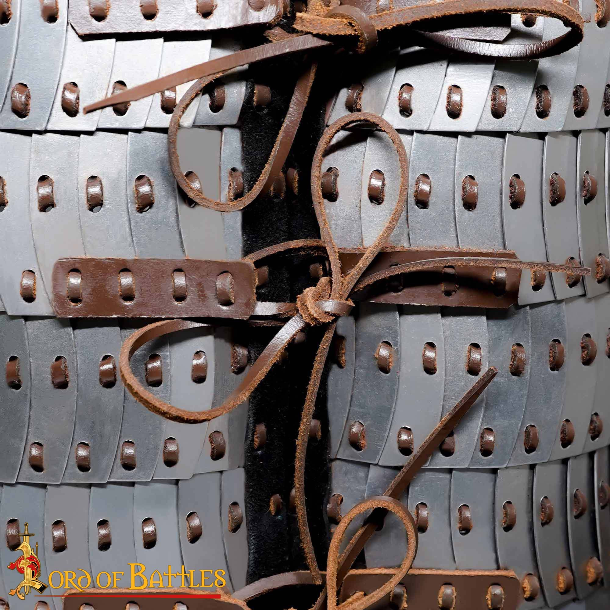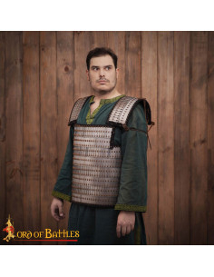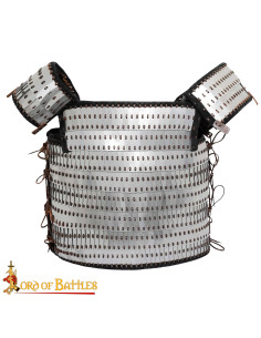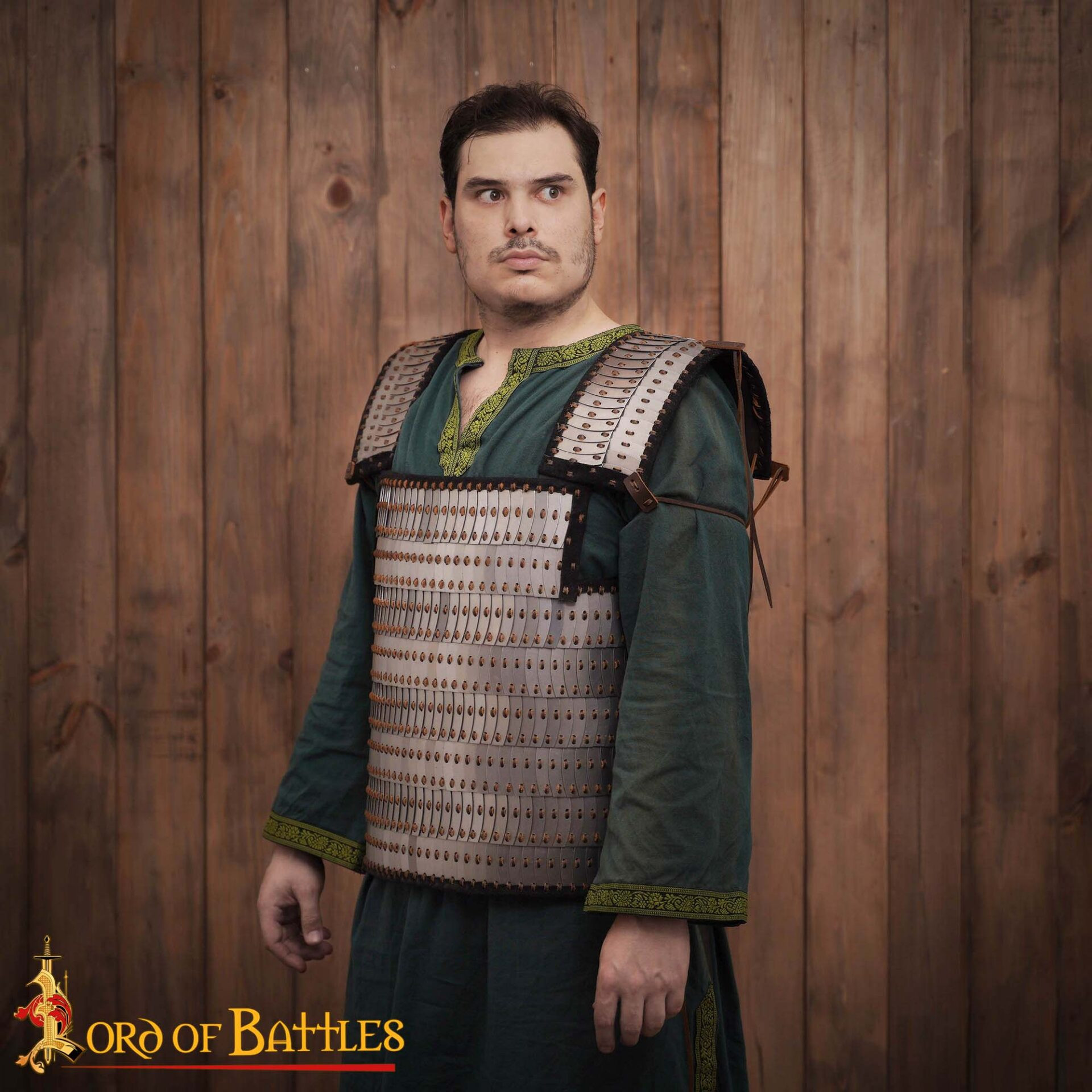 Inspirada en las tradiciones de armaduras lamellares de culturas vikingas, bizantinas y orientales, su diseño en capas proporciona una defensa flexible y efectiva. Cada escama ha sido cuidadosamente remachada a una base de cuero reforzado, permitiendo movimiento natural sin sacrificar protección, ideal para combates, ensayos o exhibiciones. Su acabado brillante en plata y los detalles en marrón aportan un toque auténtico y llamativo, mientras que sus correas ajustables en los hombros y lados aseguran un ajuste perfecto y personalizado.
