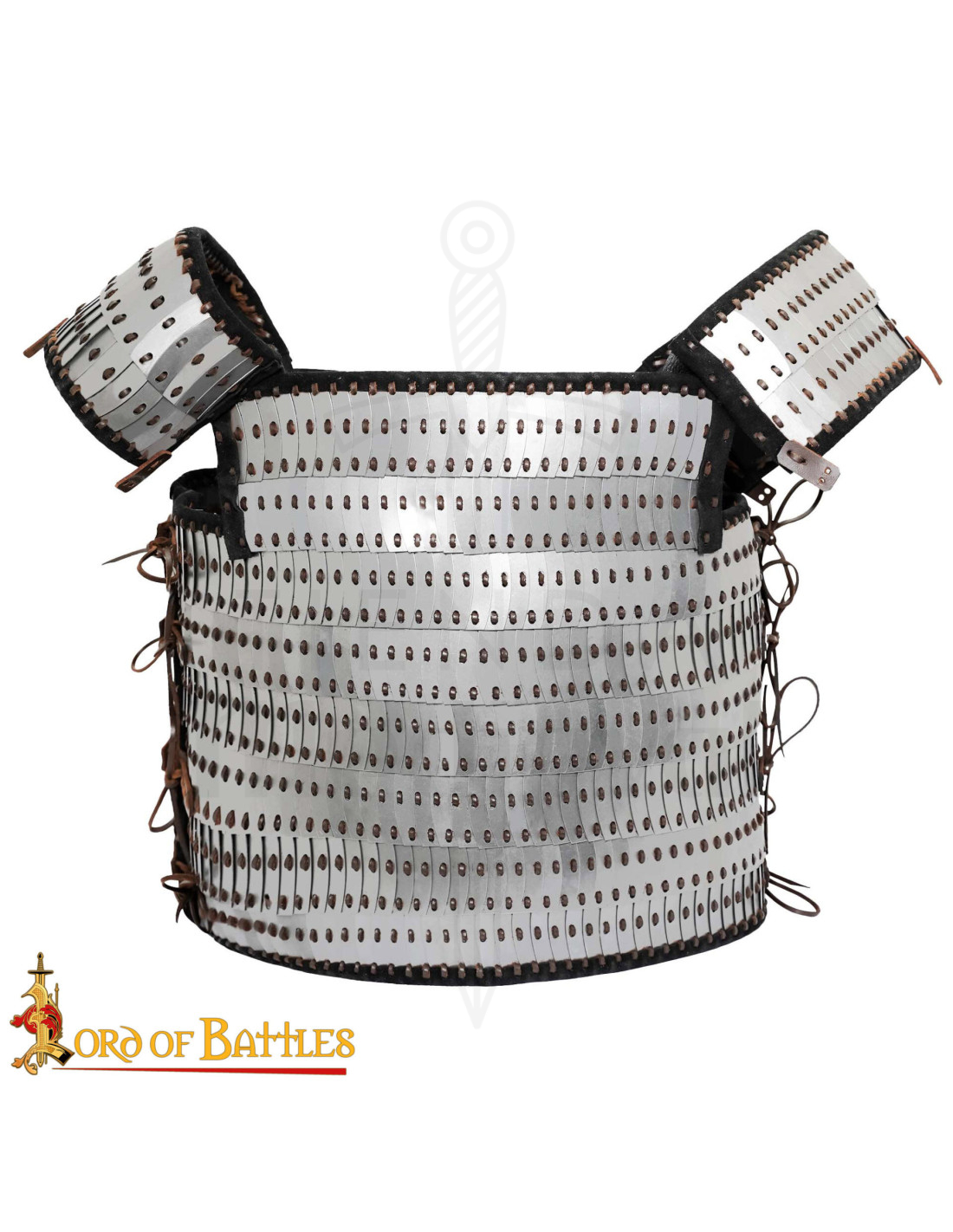 Inspirada en las tradiciones de armaduras lamellares de culturas vikingas, bizantinas y orientales, su diseño en capas proporciona una defensa flexible y efectiva. Cada escama ha sido cuidadosamente remachada a una base de cuero reforzado, permitiendo movimiento natural sin sacrificar protección, ideal para combates, ensayos o exhibiciones. Su acabado brillante en plata y los detalles en marrón aportan un toque auténtico y llamativo, mientras que sus correas ajustables en los hombros y lados aseguran un ajuste perfecto y personalizado.