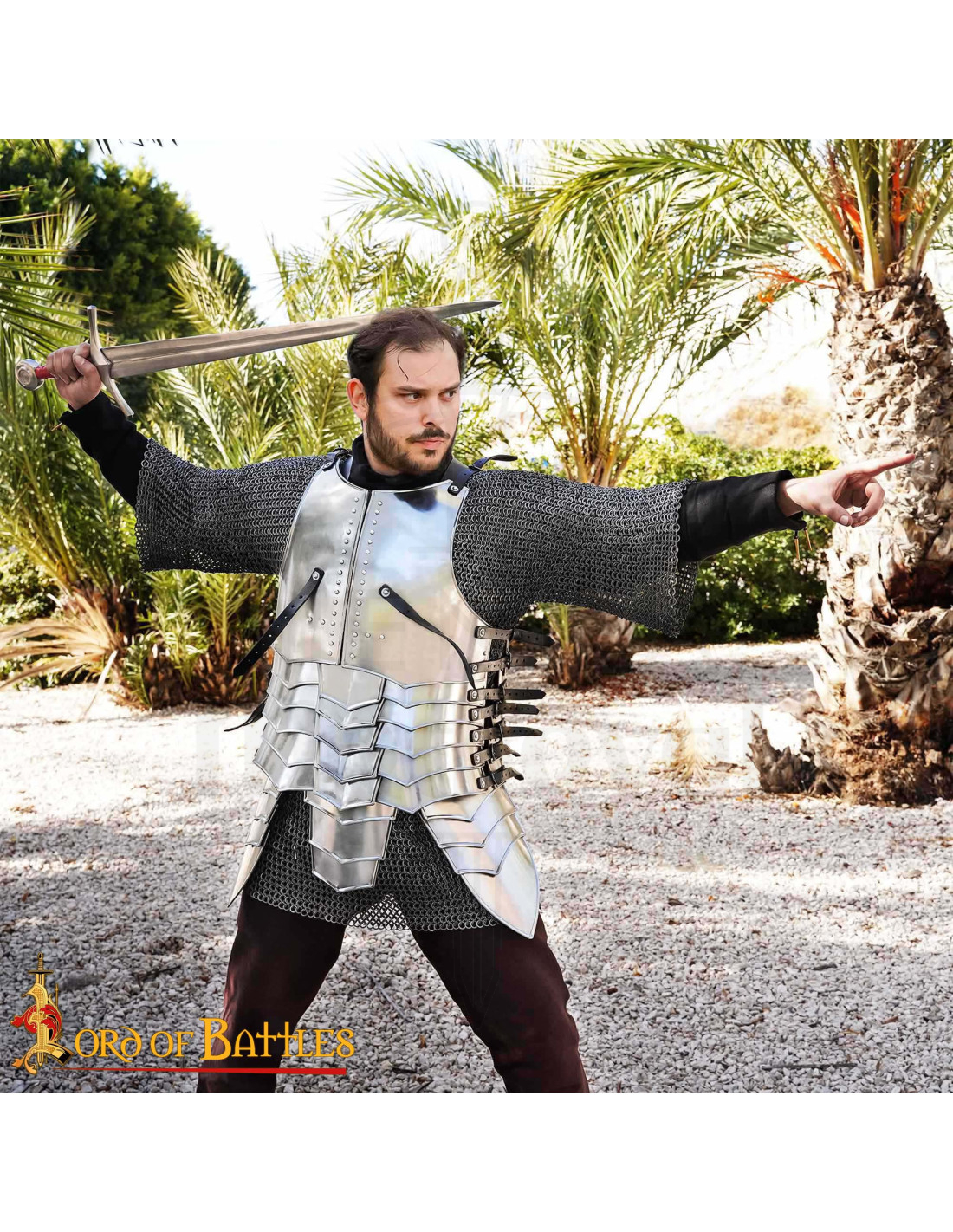 Forjada en acero pulido y trabajada a mano, ofrece una defensa contundente sin convertirse en una carga, permitiéndote moverte con agilidad durante combates, actuaciones o desfiles. Su contorno anatómico realza la figura, dando ese aspecto heroico sin perder comodidad.