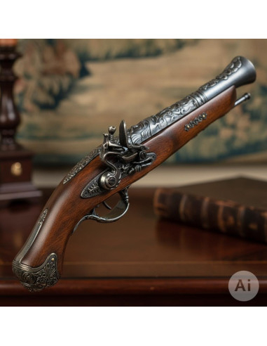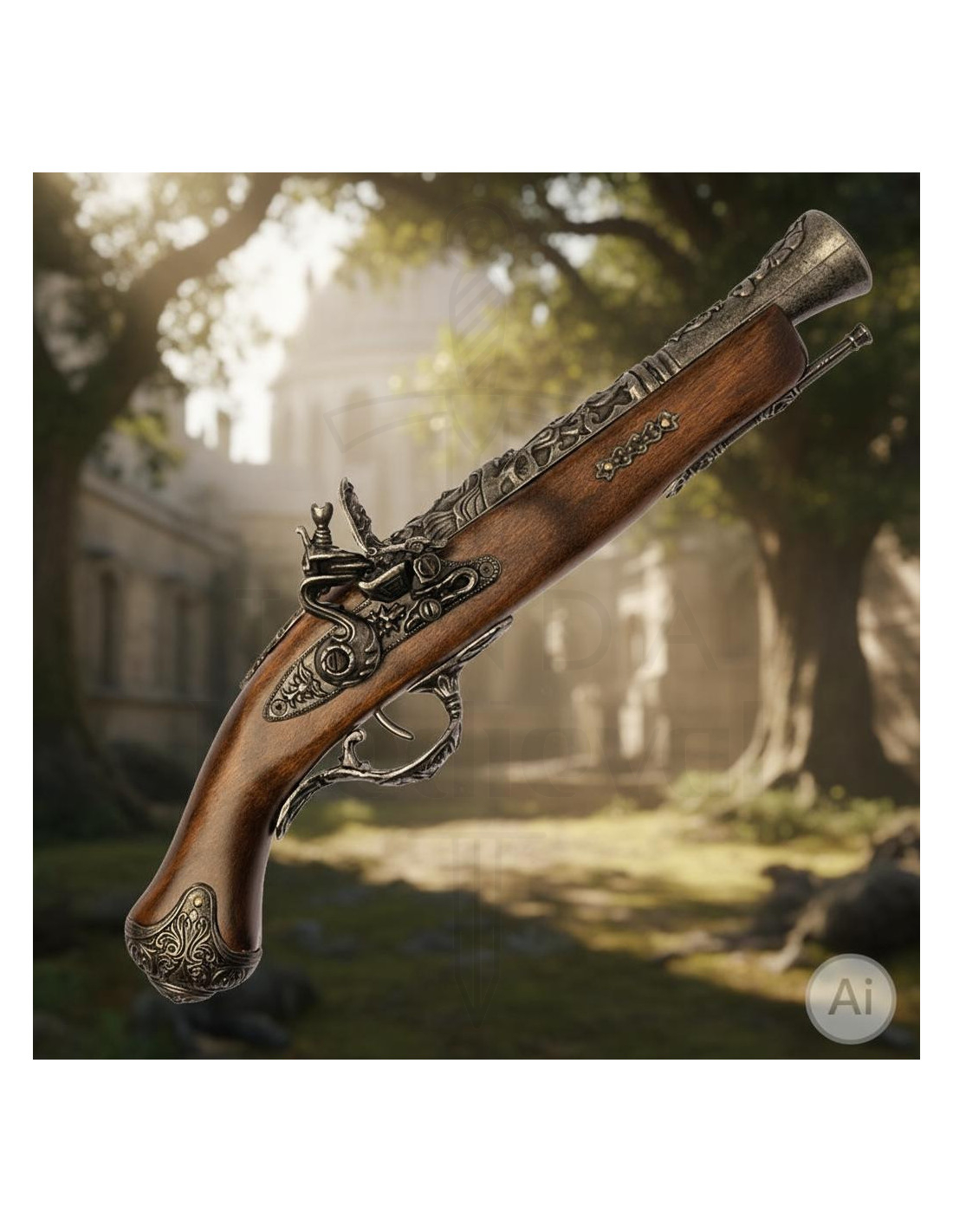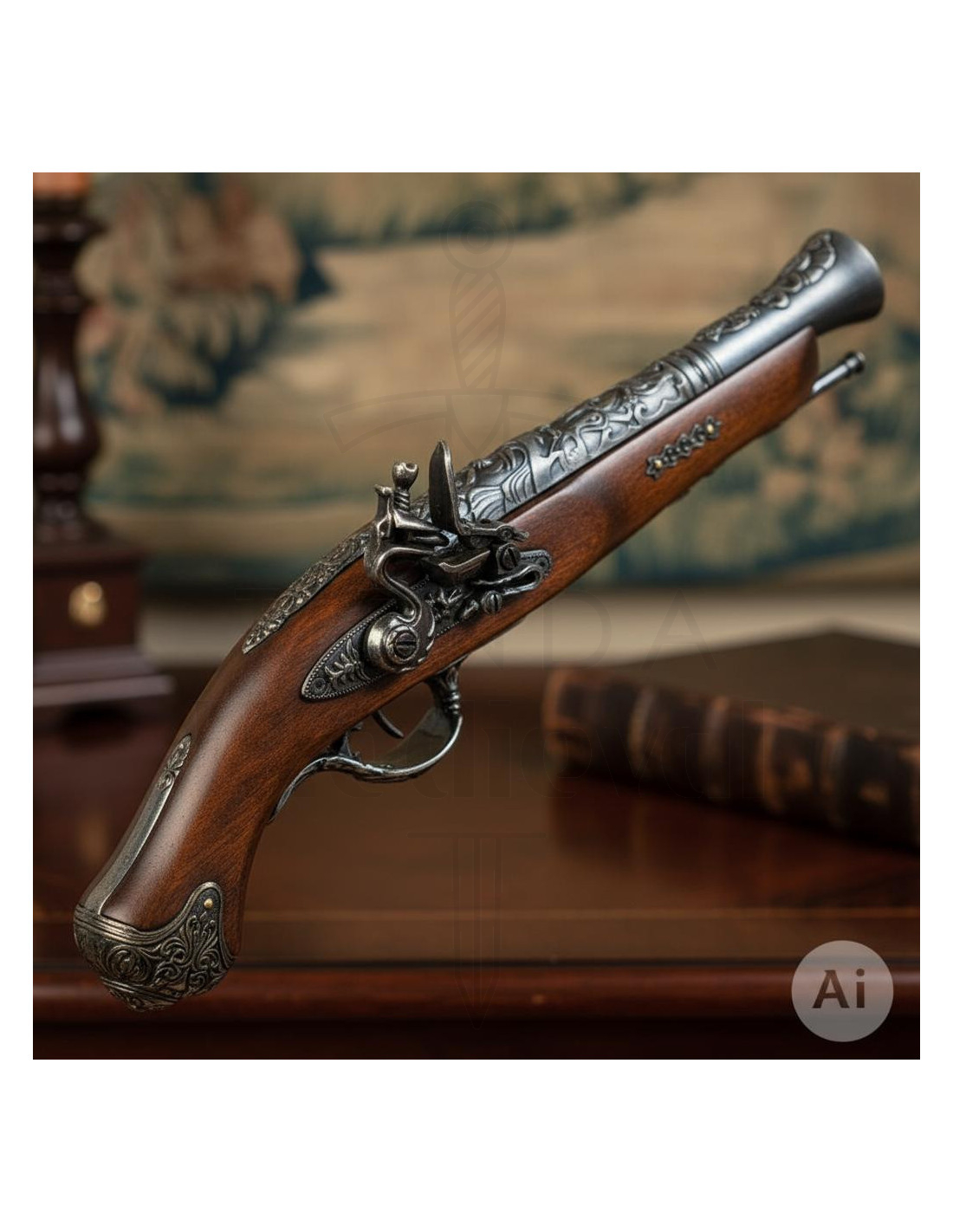 Aunque esta pistola es una reproducción no funcional, su valor como objeto de colección y elemento decorativo es indudable. Perfecta para aficionados a la historia, coleccionistas de armas antiguas o como un regalo único para aquellos que aprecian la belleza del arte y la artesanía del pasado, esta pistola es un testimonio de la habilidad y el estilo que caracterizó a la armería del siglo XVII.