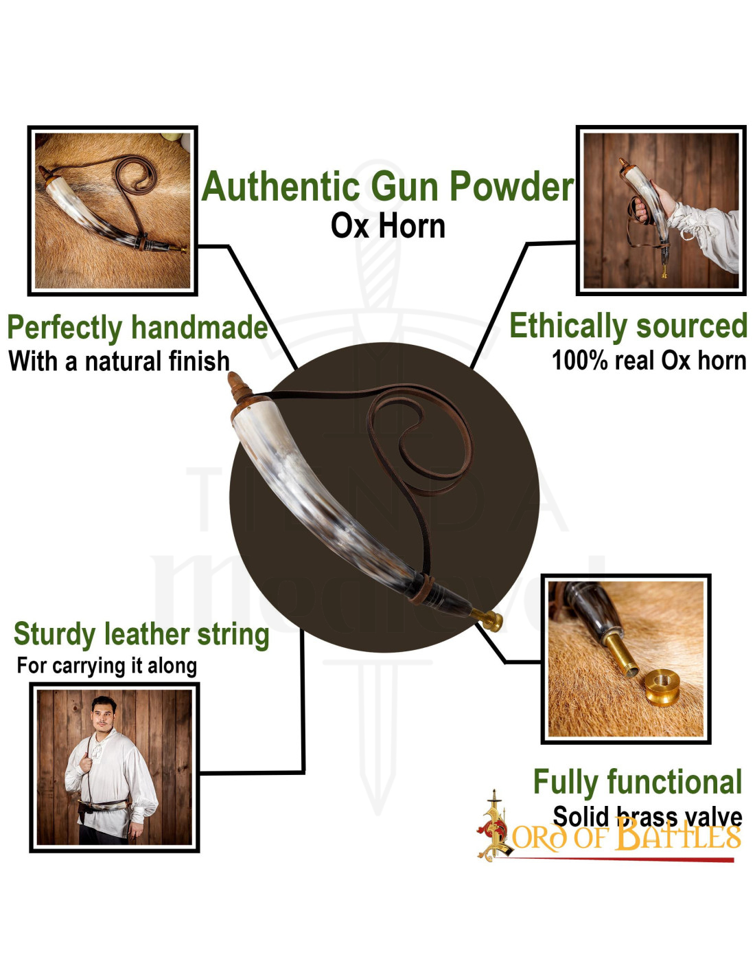 Así que no pierdas la oportunidad de revivir la emoción y la valentía de los deportes de caza medievales con nuestra polvorera de cuerno auténtico de buey. Marca la diferencia y demuestra tu autenticidad con este producto único y exclusivo de Lord of Battles.