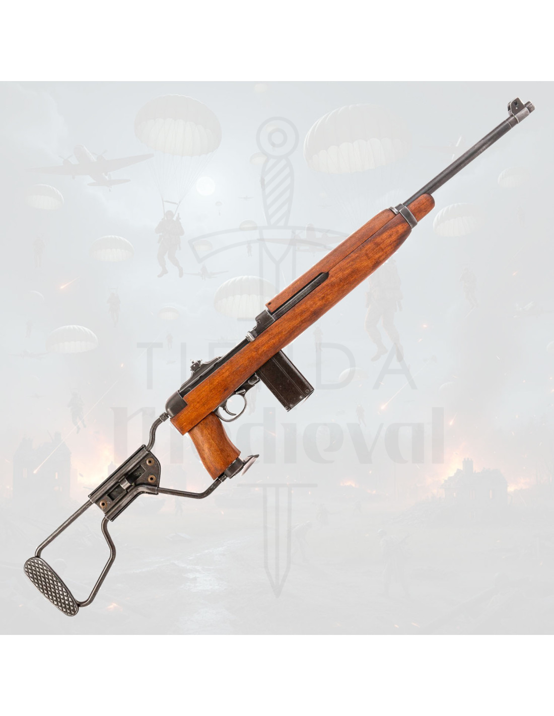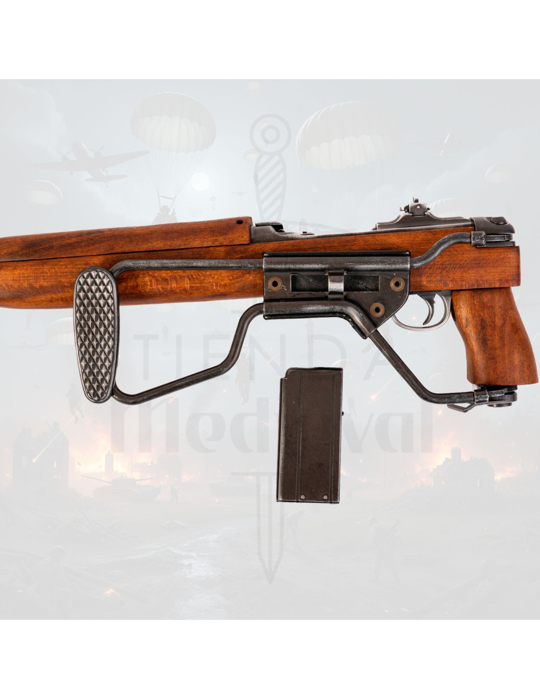 Si valoras la fidelidad histórica, comprar Réplica de la Carabina M1A1 modelo paracaidista con culata plegable, USA 1941 (2ª Guerra Mundial). te asegura una pieza con presencia, perfecta para exposición, recreación o como pieza central en una colección temática.