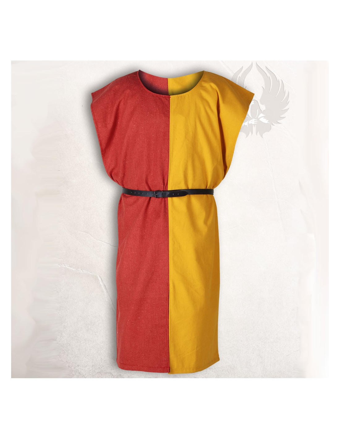 Presentamos la increíble sobrevesta medieval Ignaz en un hermoso color Rojo-Amarillo. Esta prenda, fabricada en 100% algodón, te transportará a la época de los caballeros y las batallas.