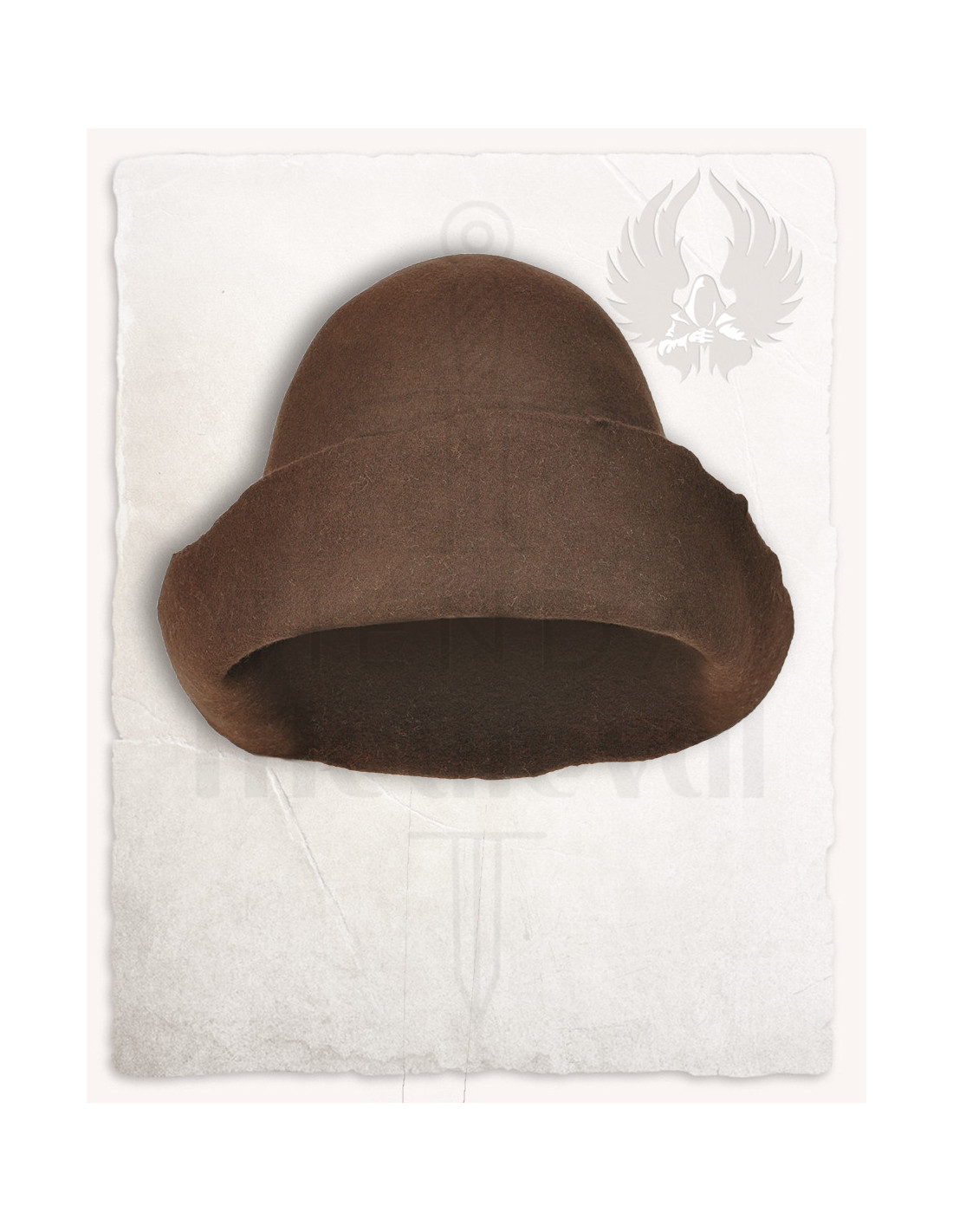 Una de sus principales ventajas es su diseño clásico, inspirado en el típico 'Bruno' que usaban tanto mujeres como hombres de diversas clases sociales en la Edad Media. Podrás adaptar su uso plegando la parte frontal y decorarlo con fibulas, insignias o bordados para personalizarlo aún más. La imagen muestra un sombrero que resalta su acabado texturizado, su forma redondeada y su ala ancha, detalles que aportan autenticidad y carácter a cada pieza.