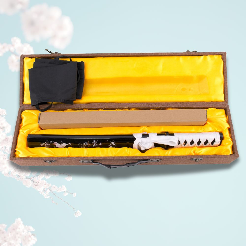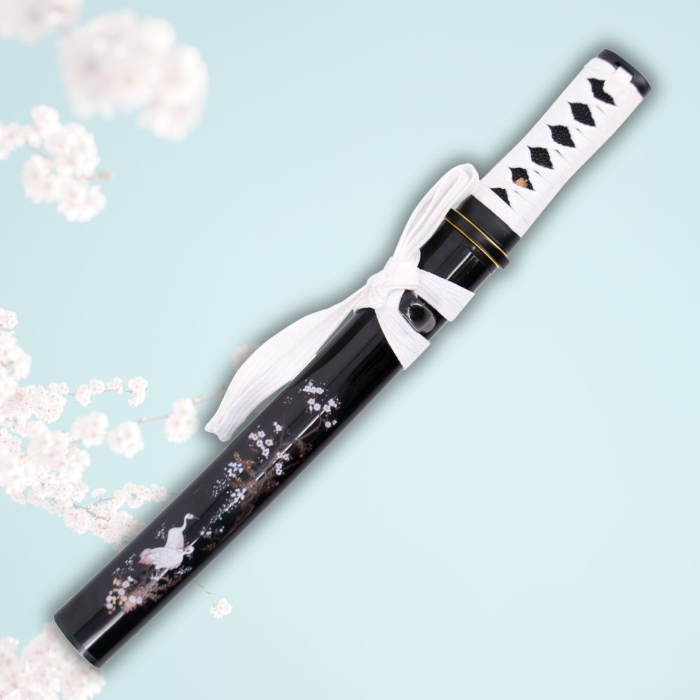 Su vaina de madera en acabado negro está decorada con elegantes detalles de flores y una grulla, lo que le otorga un aire tradicional y sofisticado. El mango, encordado en blanco con imitación de piel de raya, proporciona un agarre firme y cómodo, además de complementar estéticamente el diseño de la vaina.