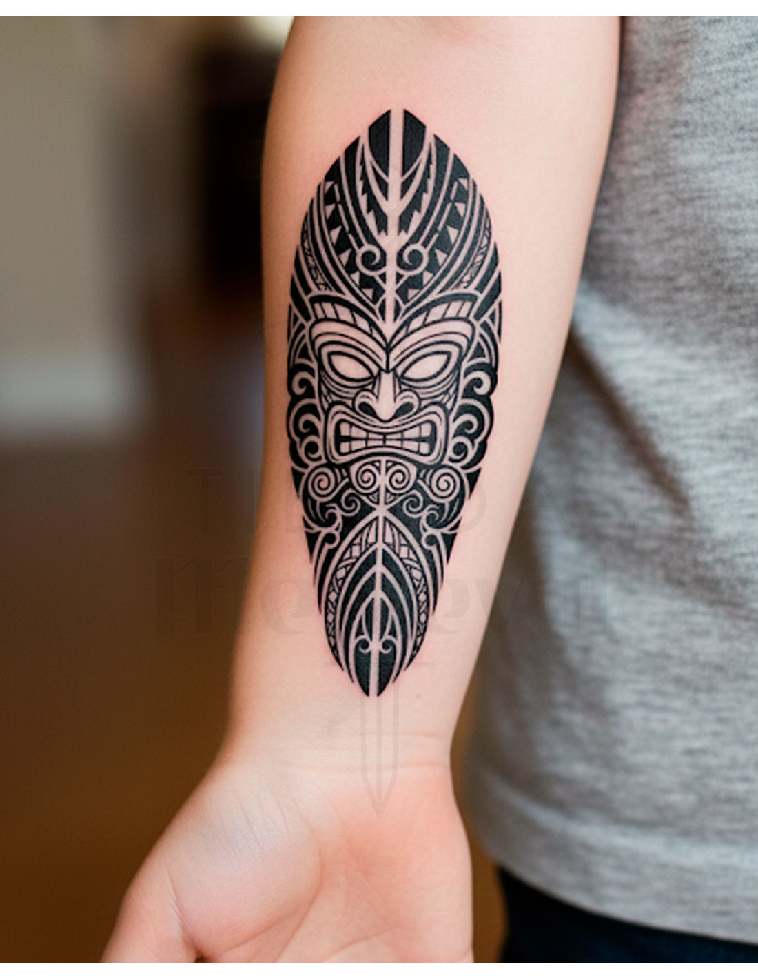 La facilidad de colocación y la durabilidad prolongada hacen que sean la opción ideal para quienes desean añadir un toque personal y cultural a su look sin cirugía. La imagen del tatuaje presenta un hermoso diseño polinesio, con líneas icónicas que reflejan la belleza ancestral de Maorí y Samoanos, enriqueciendo tu estilo con detalles culturales únicos.