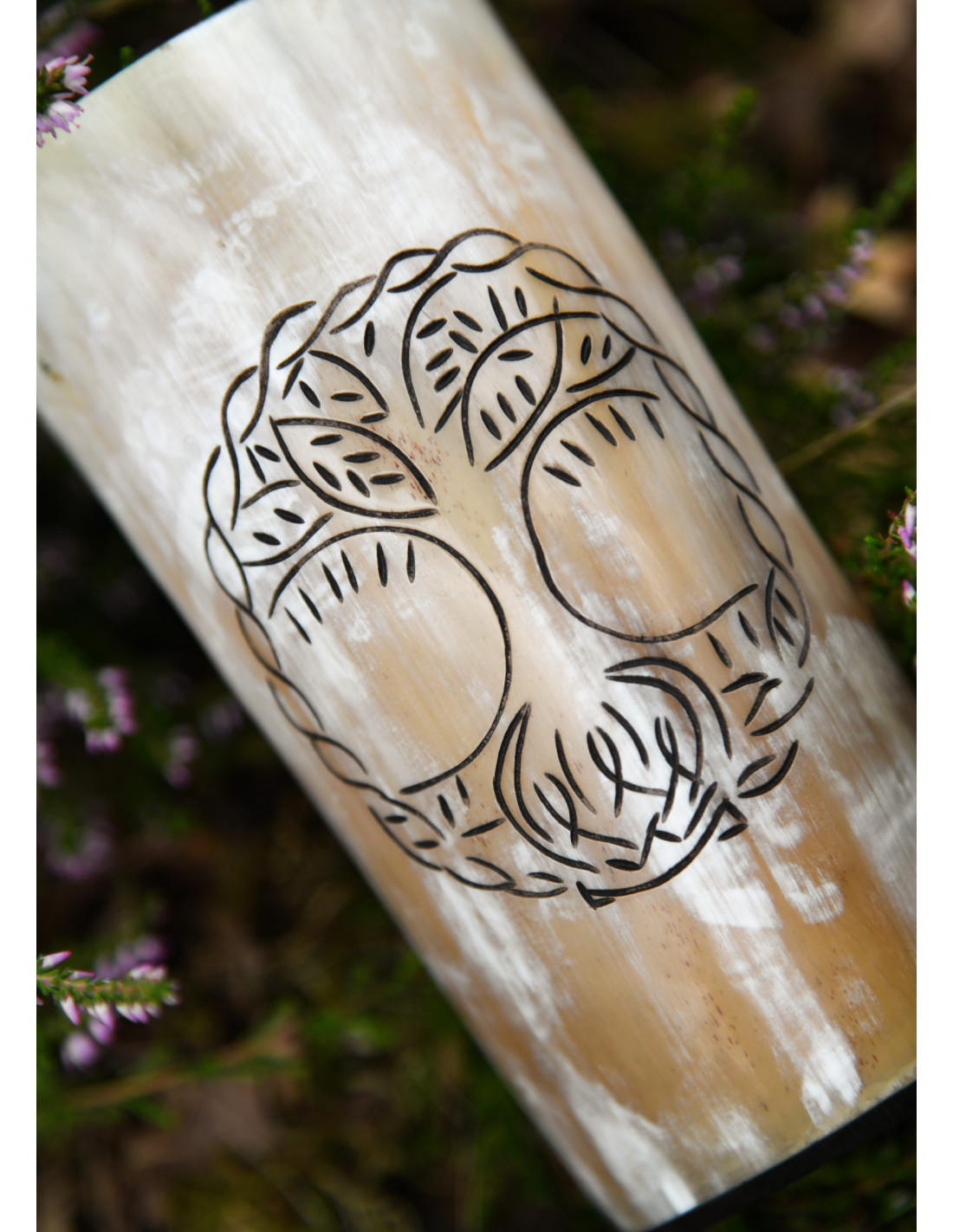 - Material excepcional: Esta taza está hecha a mano a partir de cuerno de ganado genuino (bufalo), pulido a la perfección. El motivo grabado de Yggdrasil en el cuerno agrega un toque de magia y significado.