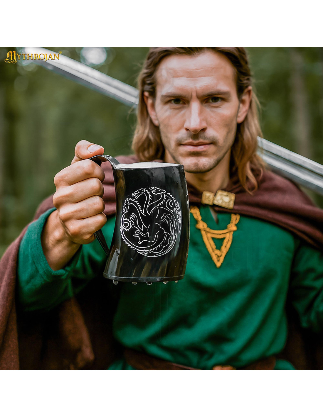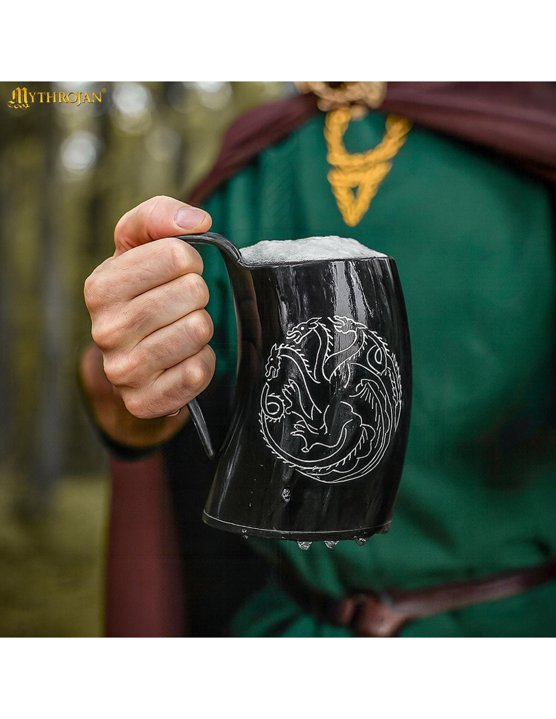 El grabado manual del emblema del dragón de tres cabezas, rodeado por un círculo de ramas, convierte cada pieza en un ejemplar único que llama la atención en cualquier mesa temática. Si te atrae la estética de fantasía medieval que popularizaron series como Game of Thrones, esta jarra captura ese espíritu heroico sin perder funcionalidad.