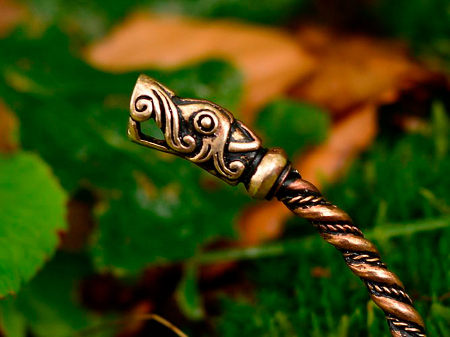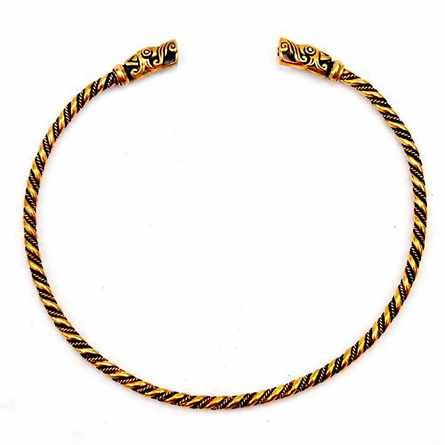 El Torque Vikingo Gotland cabezas de Dragón es un collar histórico inspirado en los modelos vikingos. Se trata de un collar de varios alambres de bronce retorcidos que cuenta con un diseño de cabezas de dragón, haciendo honor a la fascinante cultura vikinga. Este modelo en particular es una réplica histórica basada en los diseños encontrados en la isla sueca de Gotland.