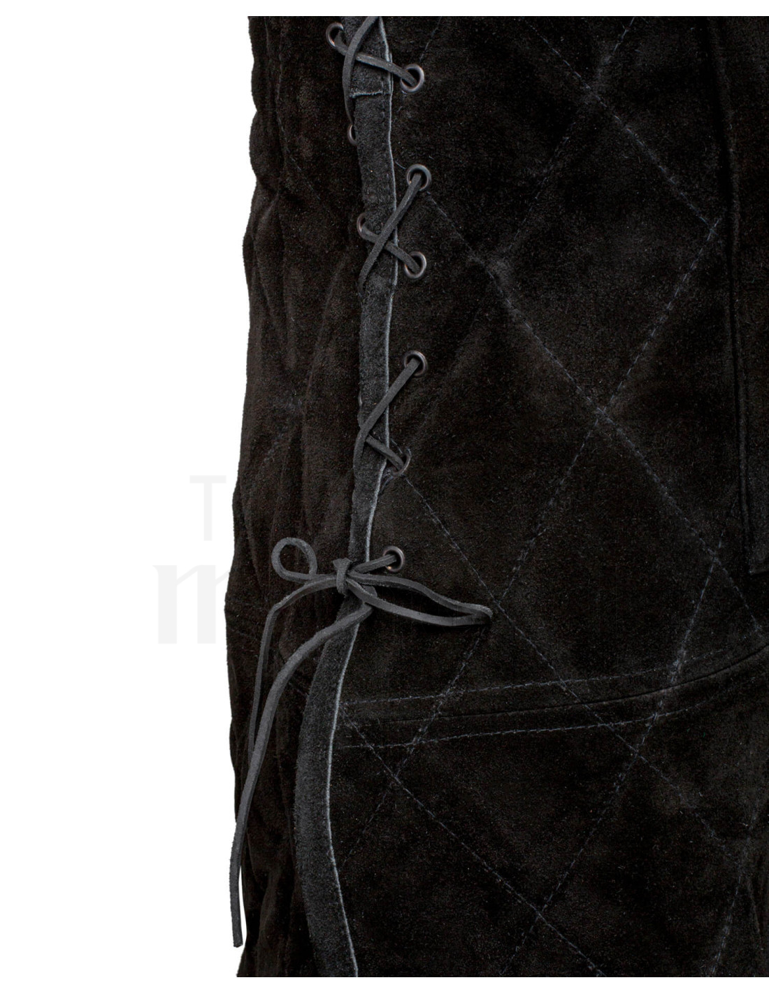 Confeccionada en suave ante, esta pieza no solo es un deleite al tacto, sino que también ofrece una movilidad excepcional. Su diseño con costuras en forma de rombo y un forro ligero permite que se use cómodamente bajo otras armaduras, protegiendo eficazmente contra los golpes en combate. Además, su estructura reforzada en el pecho asegura que se adapte perfectamente a una coraza o una cota de malla, brindando una protección adicional sin sacrificar el confort.