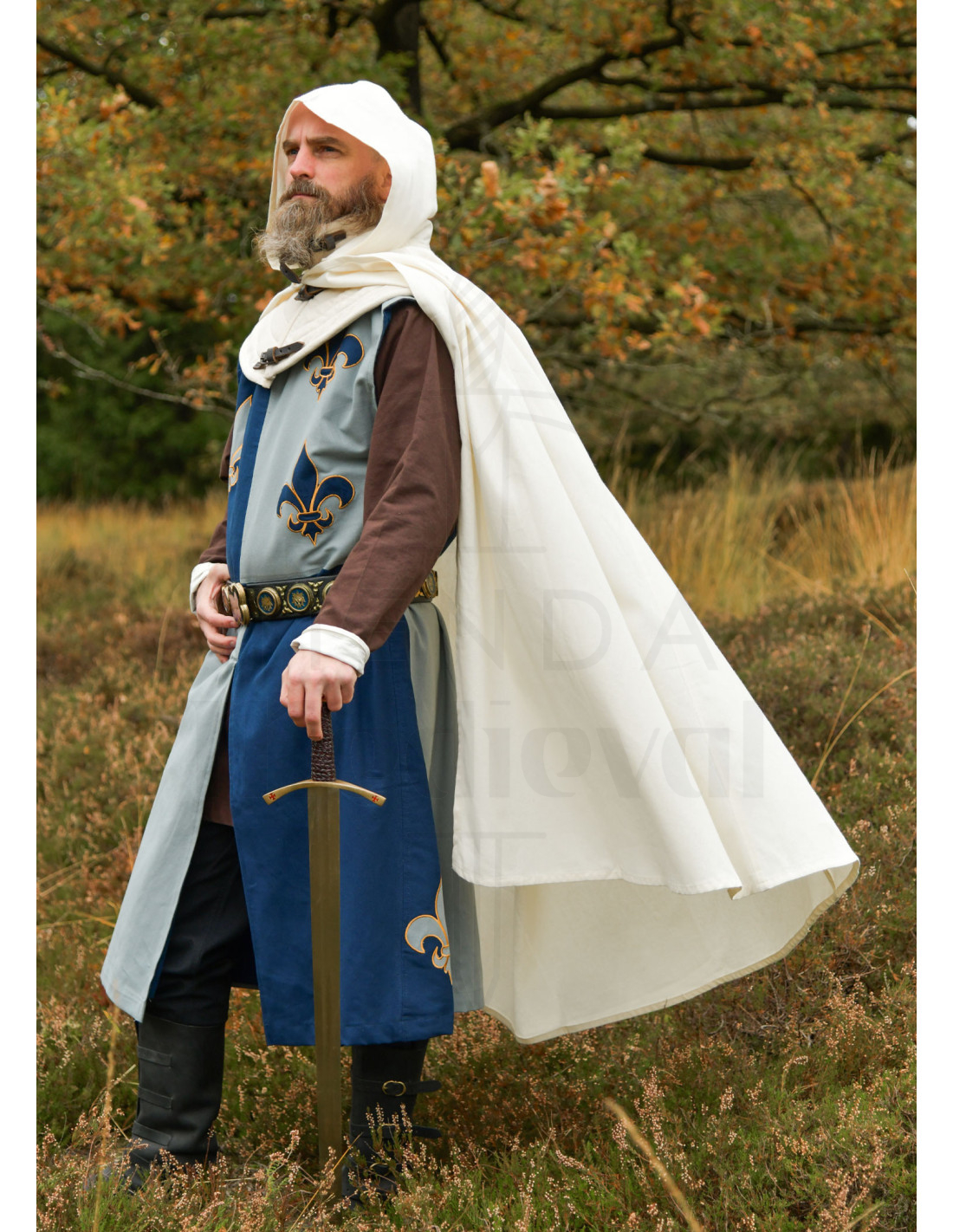 El diseño MiParti, con bloques alternos en azul oscuro y beige claro, crea un contraste visual potente que ayuda a distinguirte entre la multitud, mientras que las aplicaciones de flor de lis en tonos azul, beige y contornos dorados aportan un sello de autenticidad y presencia heráldica. Visible desde los hombros hasta alrededor de las rodillas, ofrece cobertura suficiente para climatologías cambiantes y para recrear la estética de combate sin renunciar al confort.