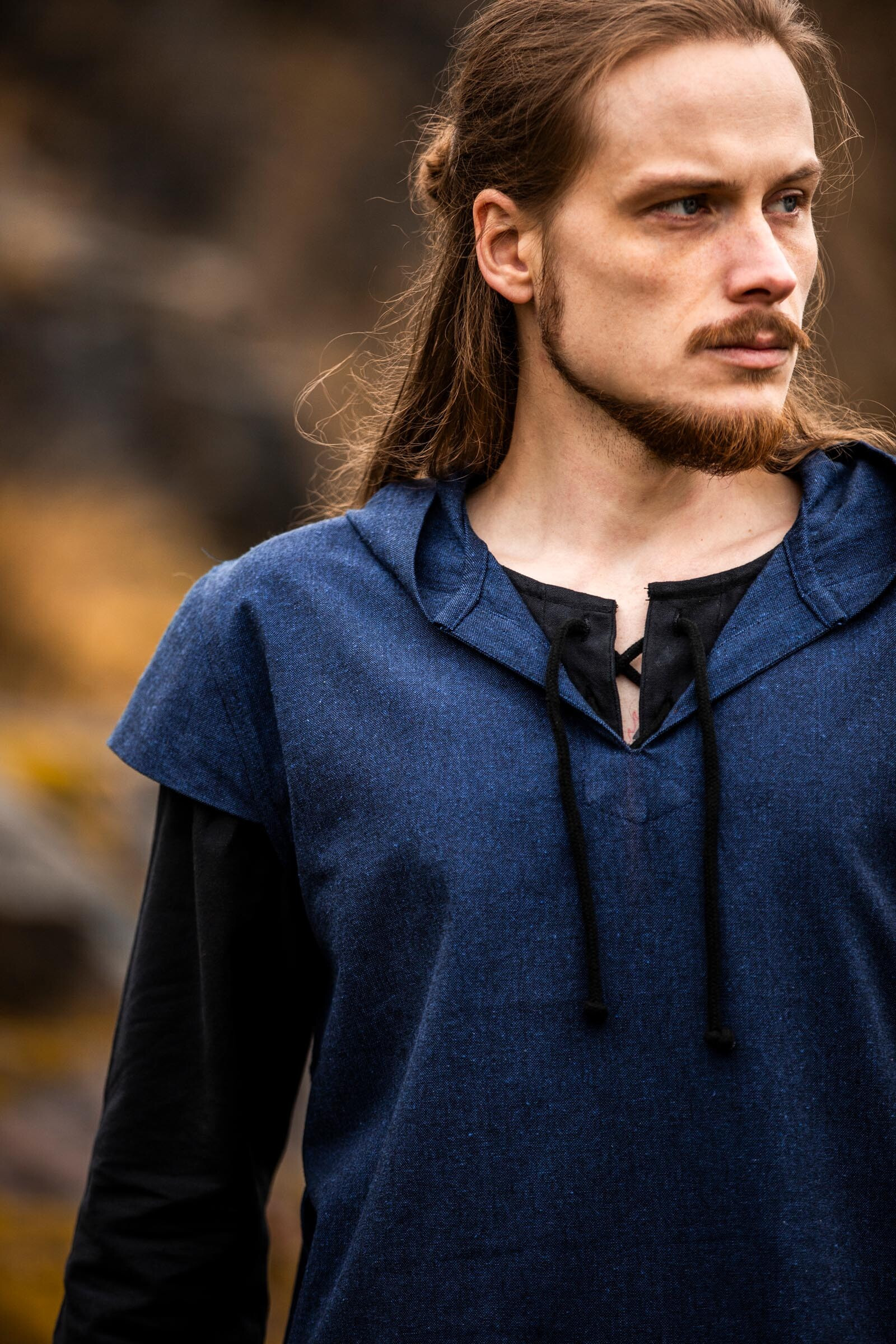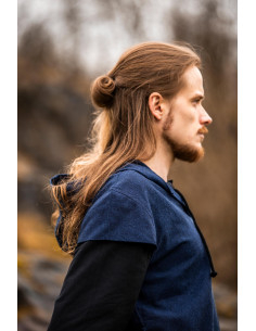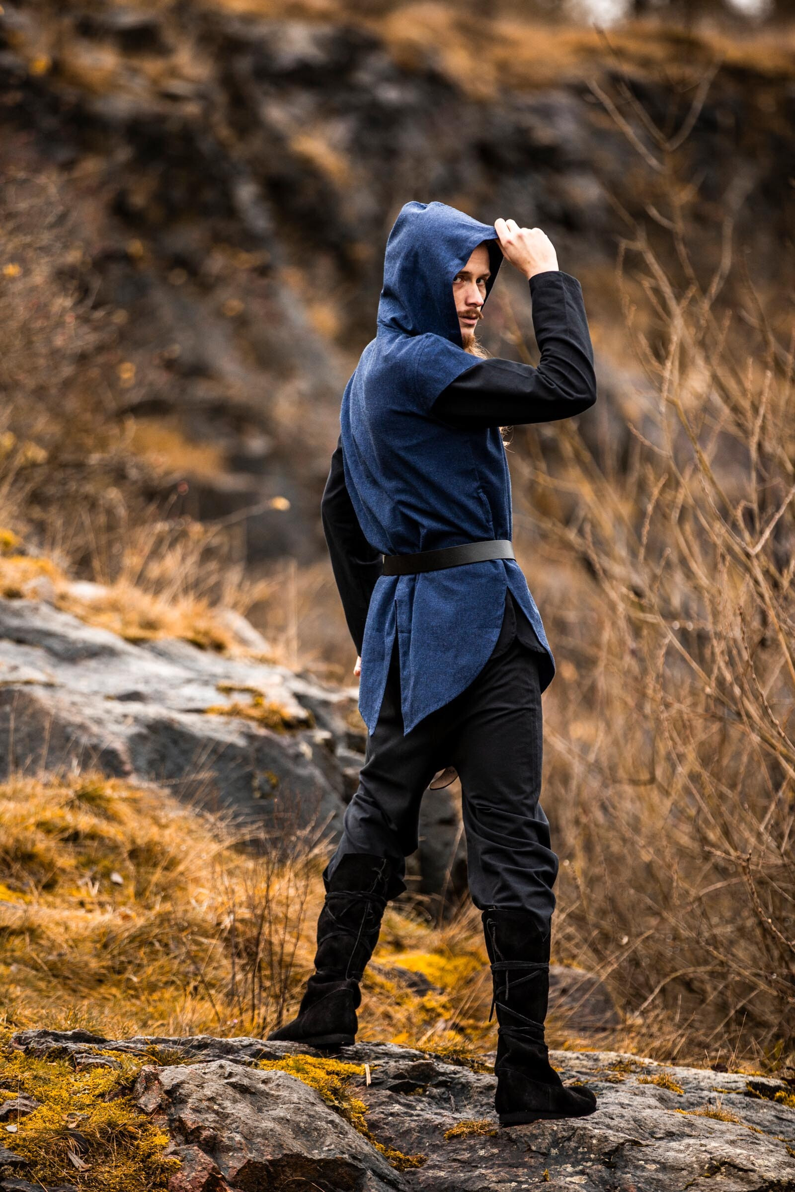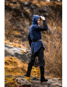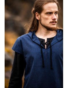 La Túnica medieval de arquero modelo Arais, azul ofrece esa sensación desde el primer uso: una capucha envolvente que protege sin limitar, y un escote en V superpuesto que añade carácter sin complicar el movimiento. Al estar sin mangas, permite movimientos libres de brazos, ideal para quienes requieren agilidad y precisión en cada gesto.