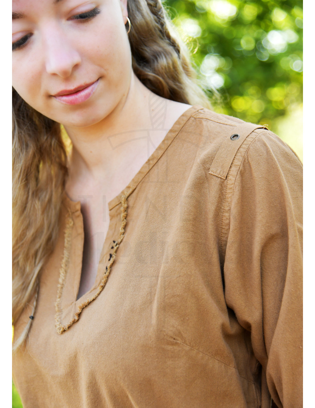 Su corte sencillo, ajustado y ligeramente entallado, asegura comodidad y un ajuste favorecedor, convirtiéndola en una base perfecta para disfraces de vikingos o personajes medievales. Las aberturas en los laterales y en las partes delantera y trasera permiten libertad total de movimiento, ideal tanto para ferias medievales, como para prácticas de LARP o recreaciones históricas dinámicas. Además, las mangas ¾ con cordón ajustable se adaptan a diferentes condiciones climáticas y necesidades del personaje.