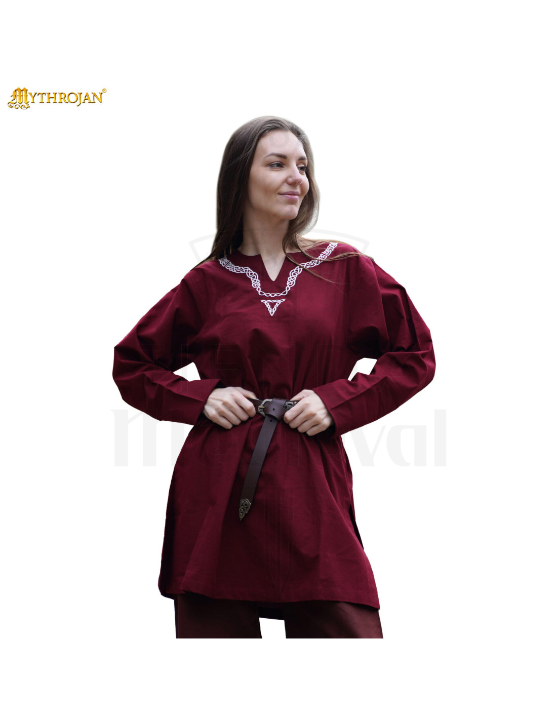 Su cuello bordado en patrones de nudos remite directamente a las técnicas textiles del Edad Media y de la Era Vikinga, aportando un toque de autenticidad y elegancia. Disponible en burdeos, un color que combina a la perfección con cinturones, capas y pantalones para crear un conjunto completo y convincente.