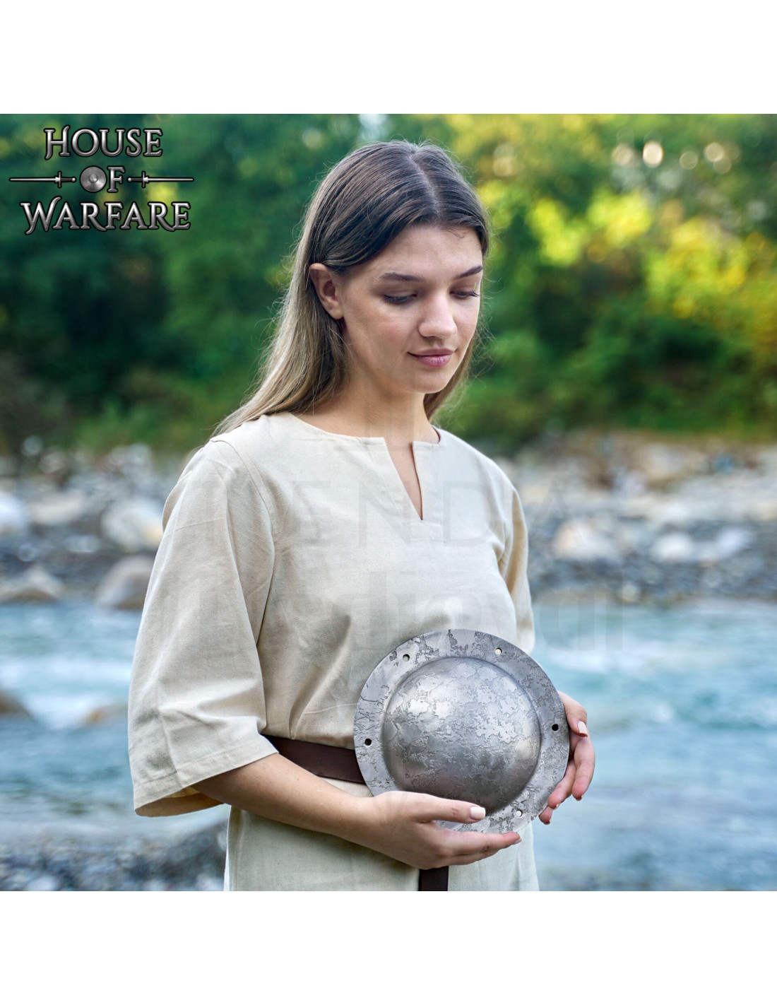 Este Umbo redondo en acero forjado a mano para escudos medievales aporta una sensación de autenticidad que mejora tanto la estética como el uso práctico del escudo. El acabado natural marteléado y el aspecto envejecido simulan el desgaste de campañas reales, ofreciendo un atractivo rústico ideal para recreaciones, utilería y restauraciones fieles al periodo.
