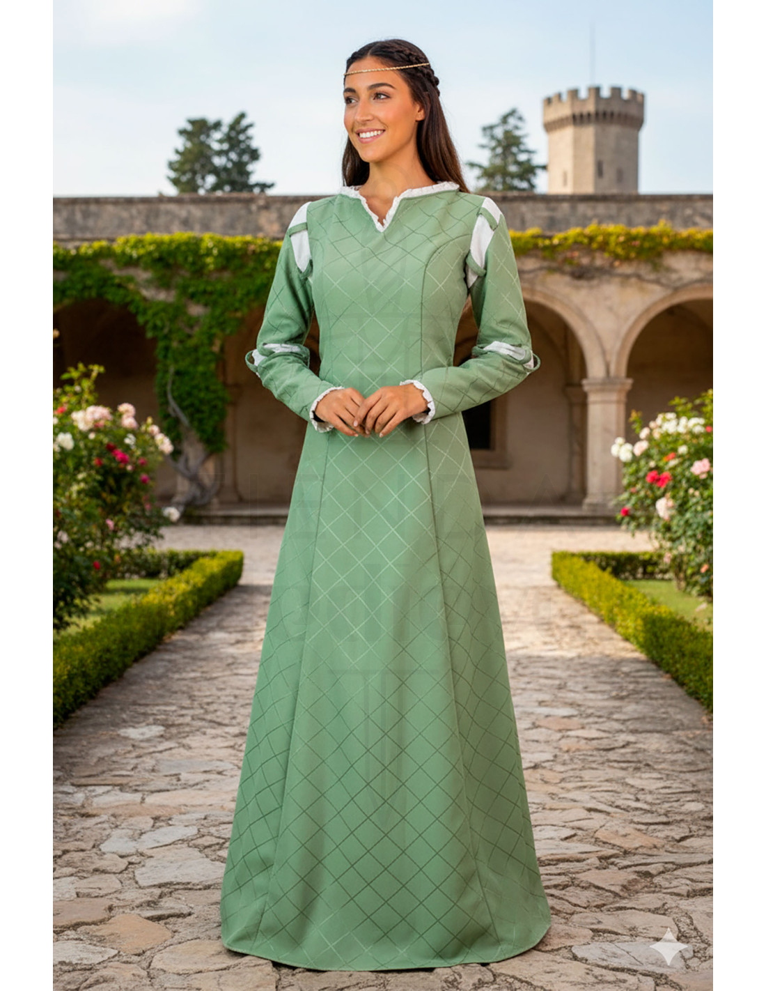 El vestido Medieval Mérida en color verde es una auténtica joya para las mujeres que buscan sentirse como cortesanas de la época. Este exquisito traje, confeccionado en ligero algodón estampado, te transportará directamente al apasionante mundo de la moda italiana del siglo XVI.