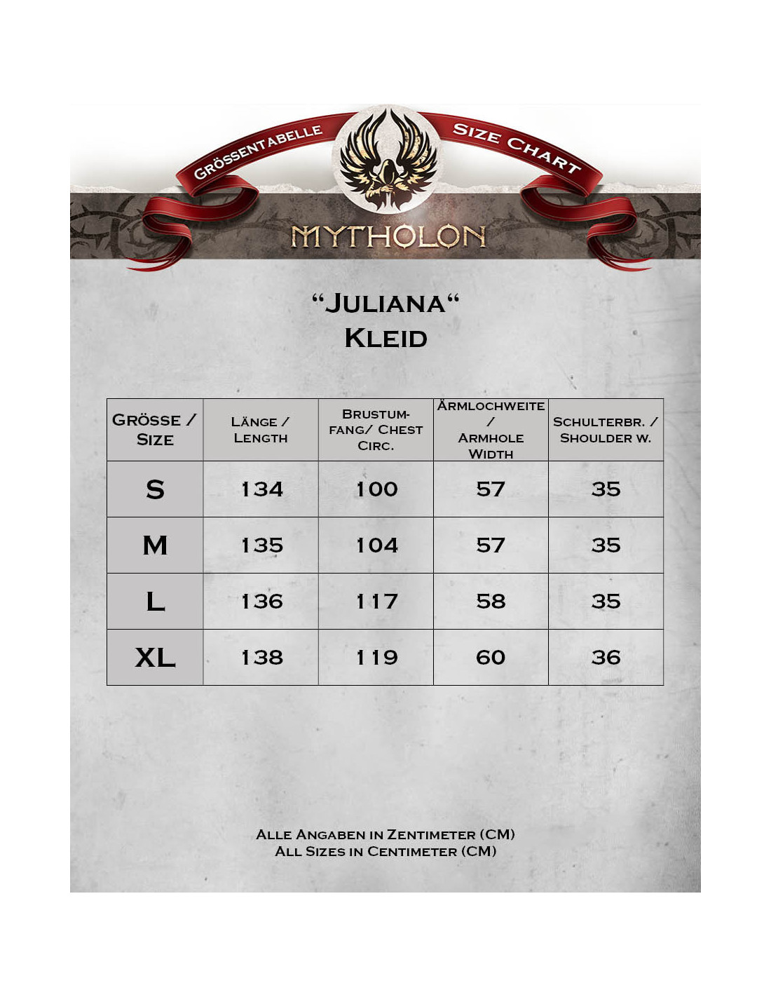 El vestido -Juliana-, de la marca alemana Mytholon, es sinónimo de calidad y autenticidad. Cada detalle está cuidadosamente diseñado para transportarte a la época medieval y hacer que te sientas como una verdadera dama noble. No importa si eres fanático de las series de época, amas los libros de fantasía o simplemente aprecias la belleza de la moda medieval, este vestido es para ti.