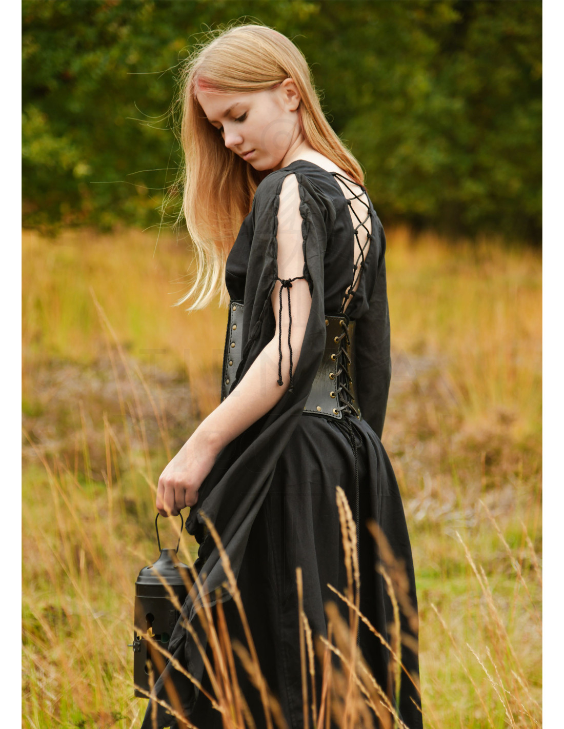 El Vestido medieval Ingrid con cordones en la espalda, color negro destaca por su escote trasero ajustable mediante una elegante cordonera, que permite moldear la silueta según tu comodidad, creando una cintura definida sin perder libertad de movimiento. Las pinzas de pecho aseguran un ajuste favorecedor, mientras que el tejido de algodón aporta una sensación ligera y transpirable para llevarlo todo el día.