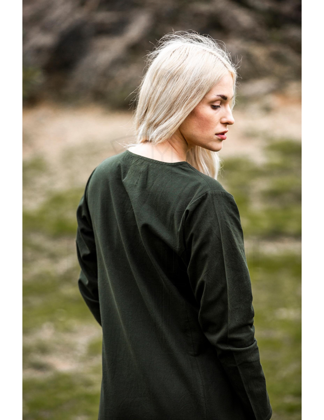 El verde oscuro del tejido aporta un aire sobrio y versátil, ideal para combinar con accesorios rústicos o detalles más refinados, según la ocasión. Su estética minimalista permite adaptarlo a estilos personales diversos, desde una interpretación fiel a la estética medieval hasta un look contemporáneo con guiños históricos.