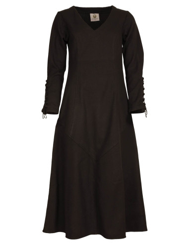 Este vestido, inspirado en la moda inglesa de principios, funciona como un vehículo para renovar tu presencia. Sus detalles —como el ricamente texturizado terciopelo, las tachuelas doradas y el cinturón bordado con un anillo de oro antiguo— no solo elevan tu apariencia, sino que también refuerzan tu confianza y tu deseo de marcar tendencia con autenticidad. El suave rayón rojo granate y el forro de algodón redondean una experiencia que invita a sentirte cómoda, segura, con esa sensación de estar lista para afrontar cualquier aventura con estilo y arte, sin dejar de lado la practicidad y el confort.