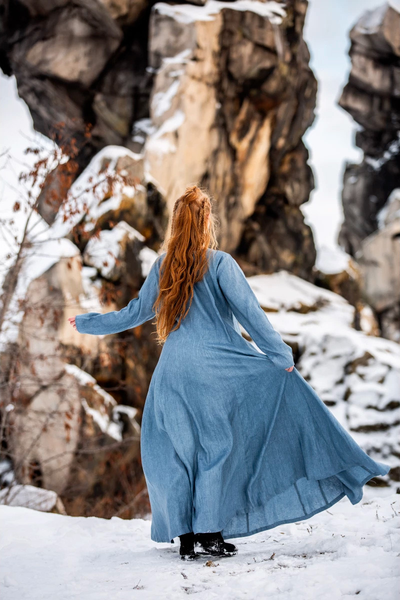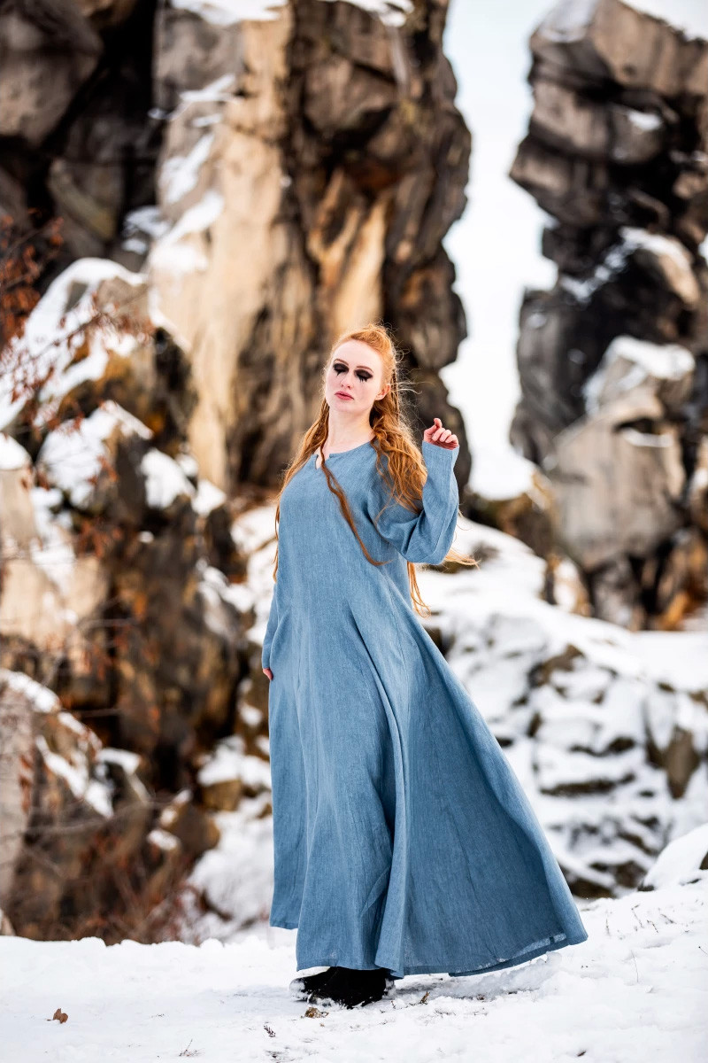 ¡Sumérgete en la elegancia vikinga con el Vestido Anna en azul de Leonardo Carbone! Este exquisito vestido de lino ligero es la elección perfecta para quienes buscan un estilo auténtico y distinguido inspirado en la era vikinga.