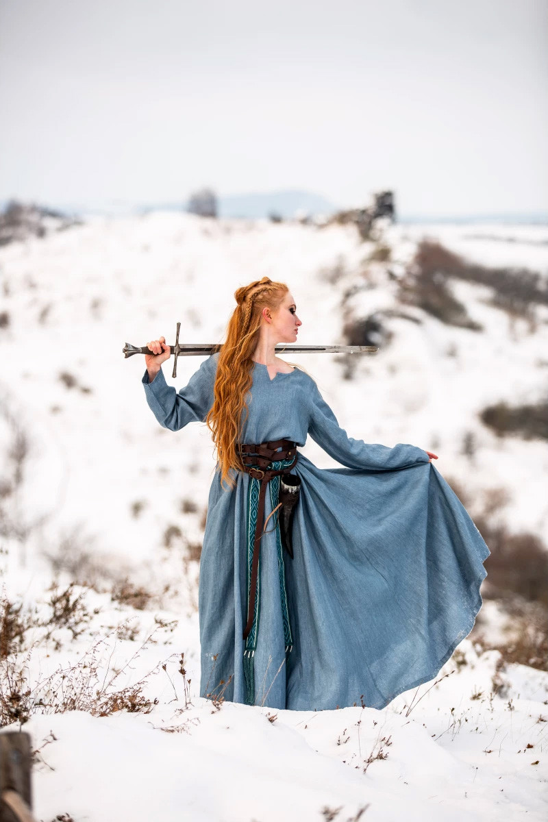 El Vestido Anna está confeccionado con un tejido de lino de alta calidad, que proporciona una sensación fresca y cómoda, ideal para los días soleados de verano en festivales medievales o eventos temáticos. Su ligereza te permite moverte con gracia y libertad, mientras te sumerges en la atmósfera de la época vikinga.