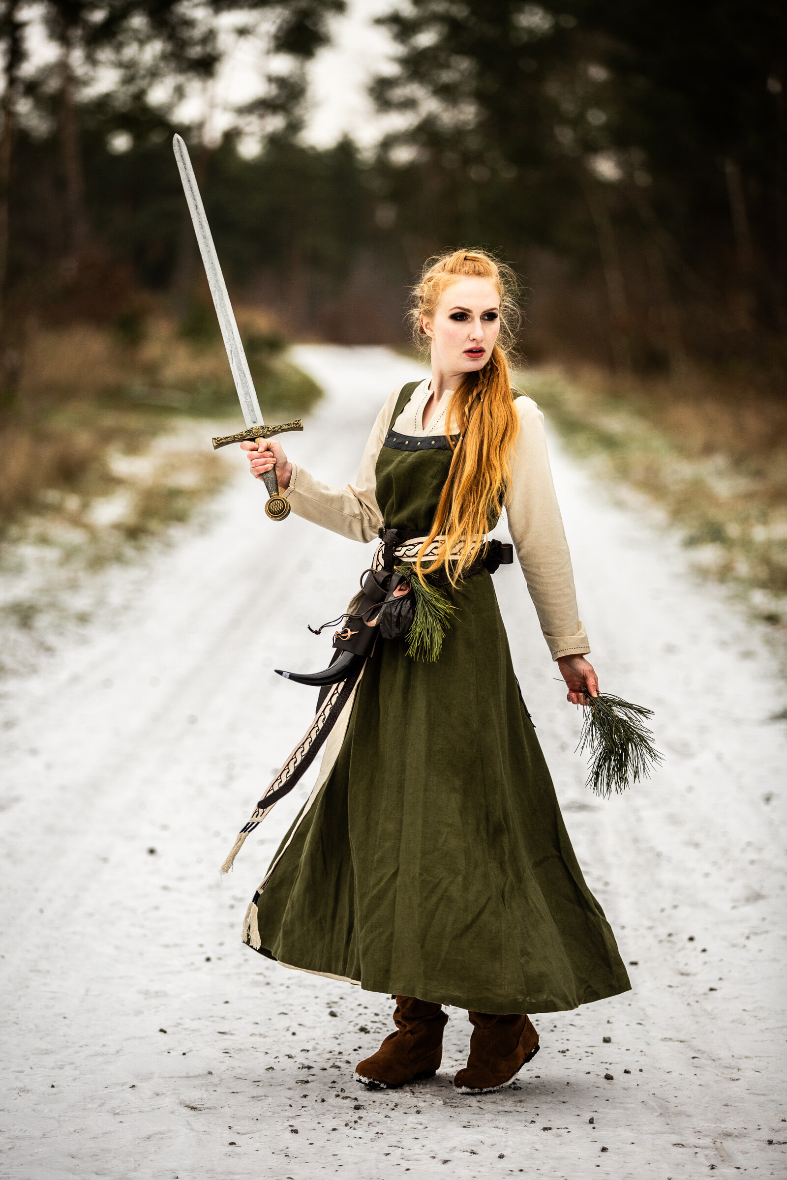El sobrevestido vikingo Alena, confeccionado en suave lino de color verde oliva, destaca por su diseño versátil que se adapta perfectamente a tu silueta. Con tirantes anchos y ajustables, podrás personalizar el fit hasta lograr el estilo que más te favorezca. Su espléndida espalda con diseño de encaje garantiza un ajuste ideal, mientras que la falda larga y fluida, que se desliza hasta los tobillos, añade un toque majestuoso a cada paso que das.