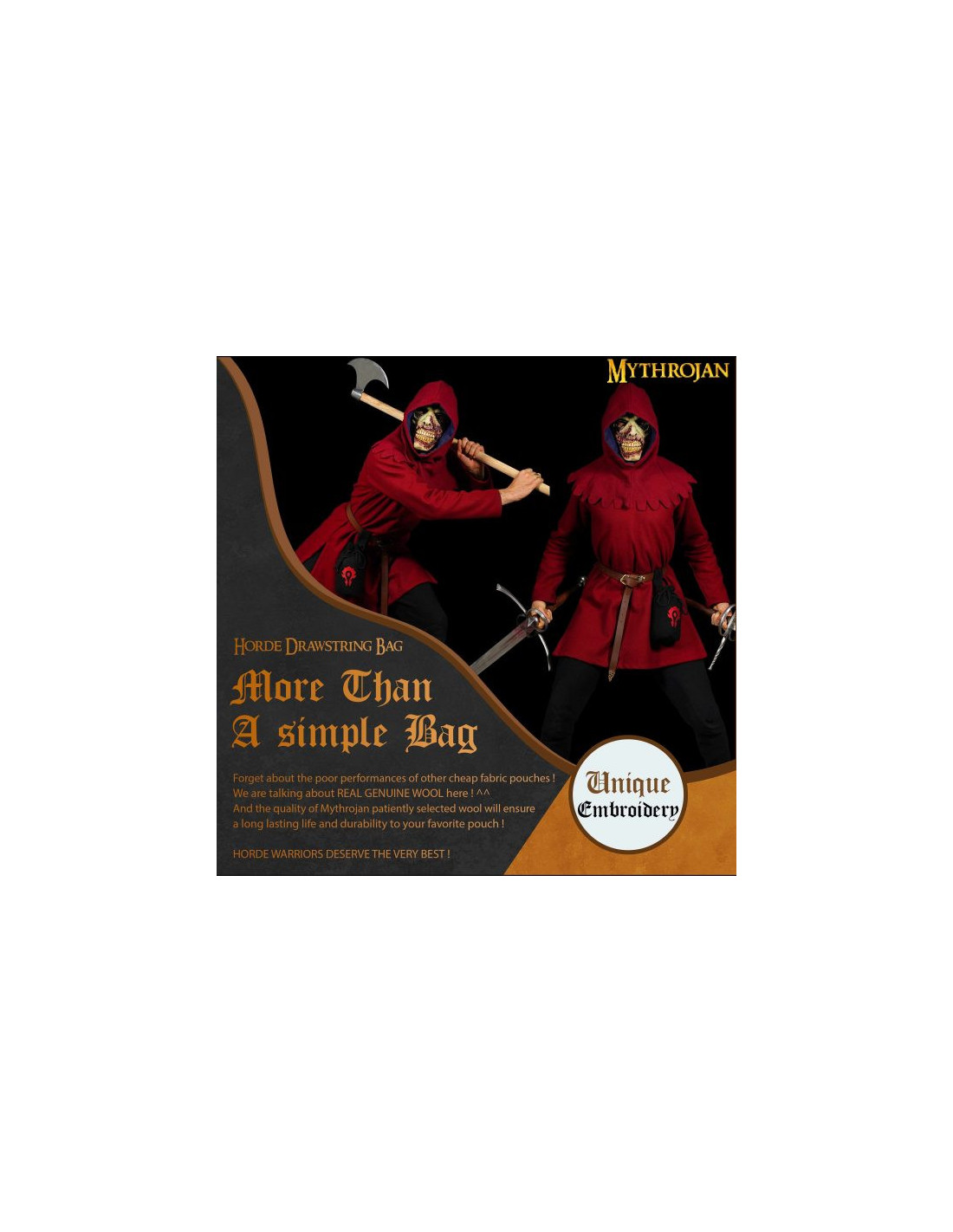 Así que no esperes más y adquiere la bolsa NO oficial World of Warcraft ""For The Horde"" en su versión ""hecha a mano con lana suave y atractiva de alta calidad"". No te arrepentirás de llevar contigo un pedacito del universo de Warcraft y de hacer parte de la Horda estés donde estés. Elige calidad, autenticidad y estilo. Elige la bolsa ""For The Horde"".
