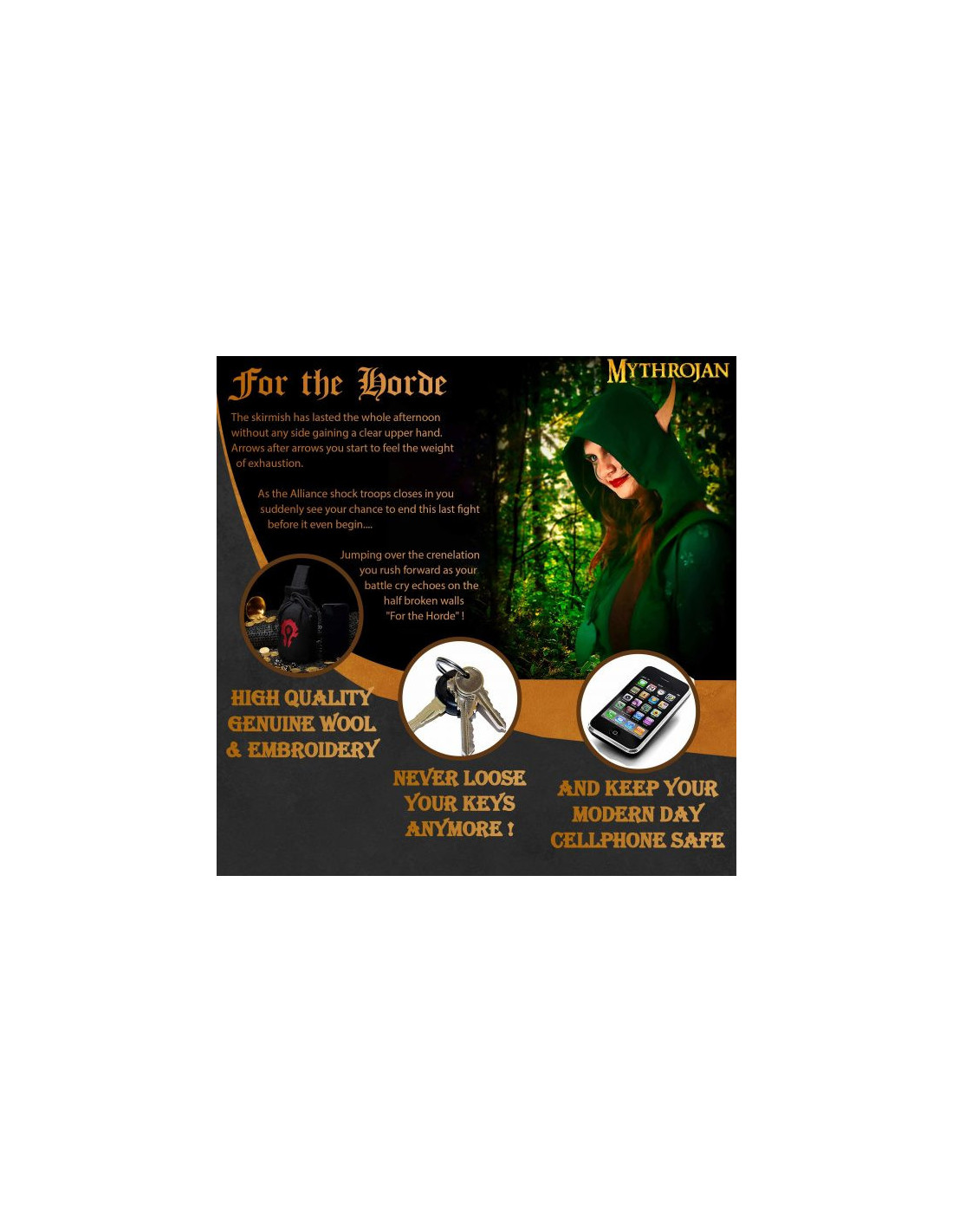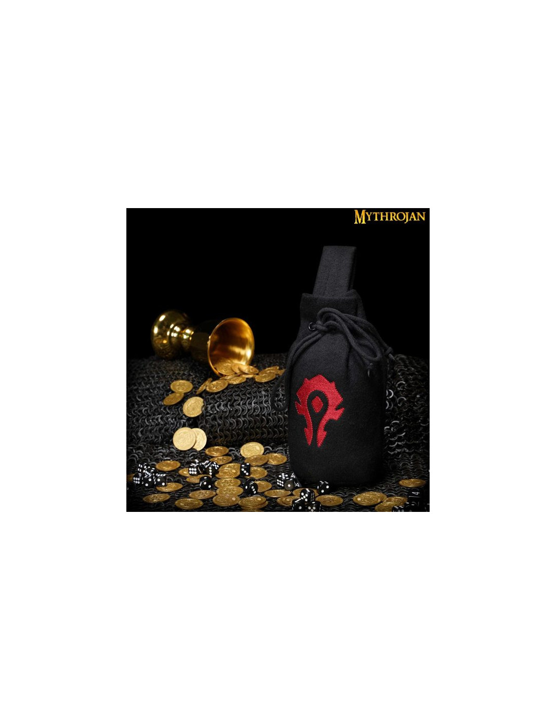 Esta bolsa es el compañero perfecto para cualquier aventura. Con su tamaño perfecto, la bolsa ""For The Horde"" de Mythrojan te acompañará en todos tus viajes épicos. Su diseño robusto y confiable, inspirado directamente en el rico universo de Warcraft, mantendrá tus pertenencias más preciadas a salvo. Podrás llevar tu teléfono, llaves y todo lo que necesites sin preocuparte por su seguridad. Además, su amplia capacidad de 20.3cm×16.5cm te resultará más que útil en cualquier evento o incluso en tu vida diaria.