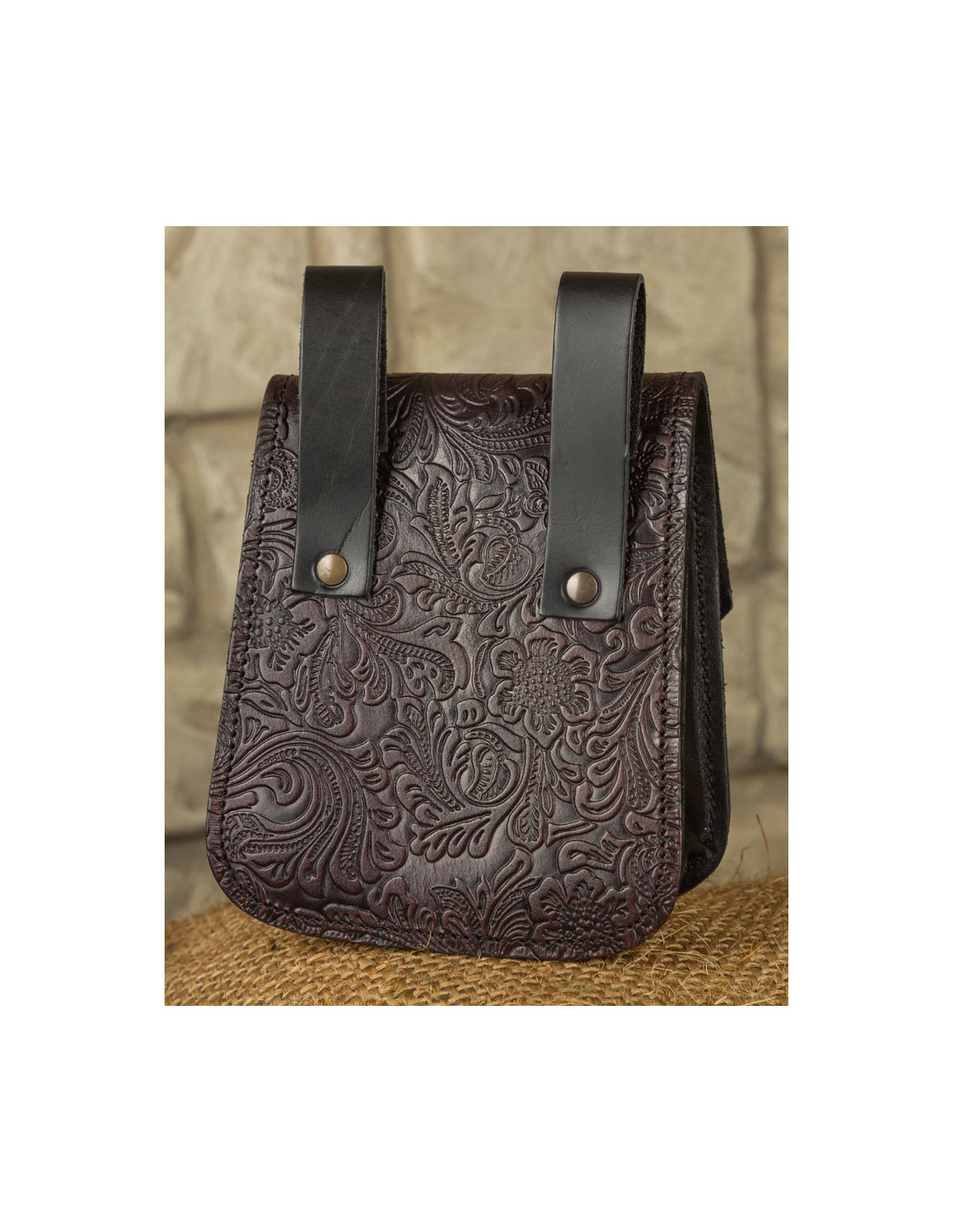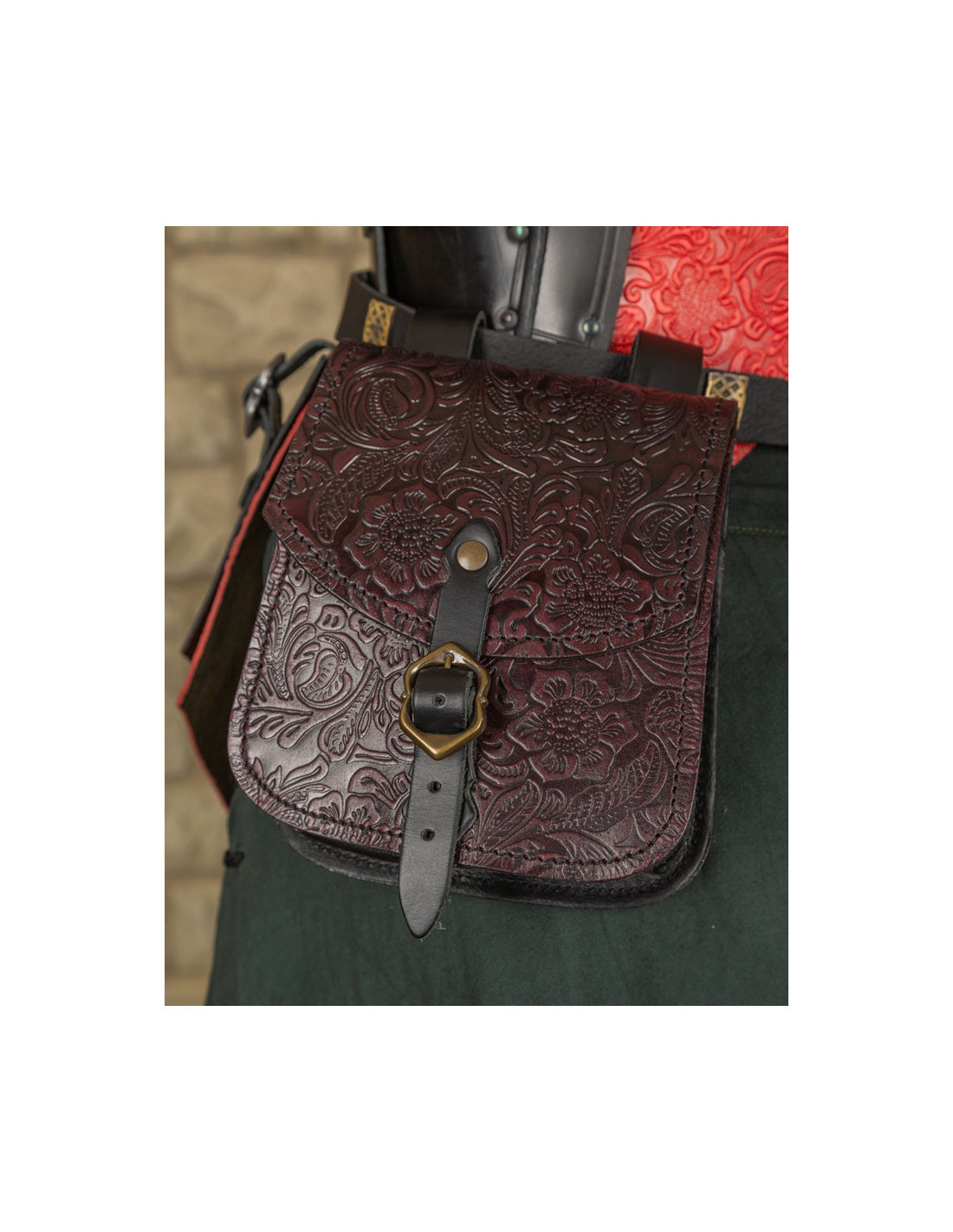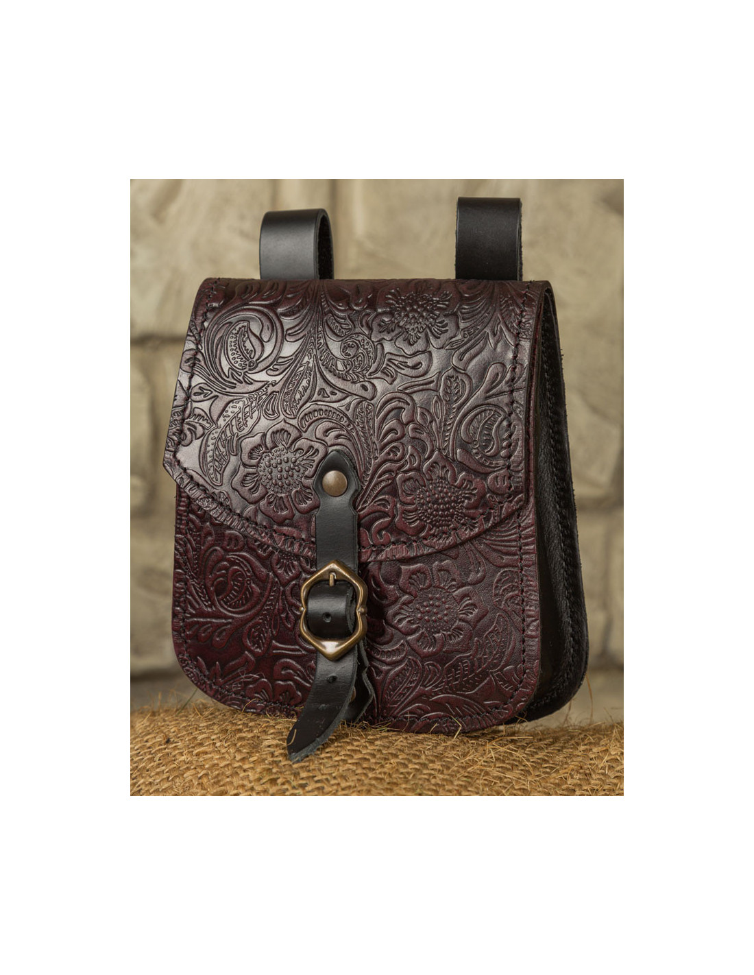 De middeleeuwse tas Beatriz in roodachtig leer met reliëf is het perfecte accessoire om uw waardevolle spullen te vervoeren terwijl u zich onderdompelt in de middeleeuwse wereld. Met zijn unieke en elegante ontwerp valt deze tas op door zijn bloemendecoraties die een vleugje vrouwelijkheid en verfijning toevoegen.