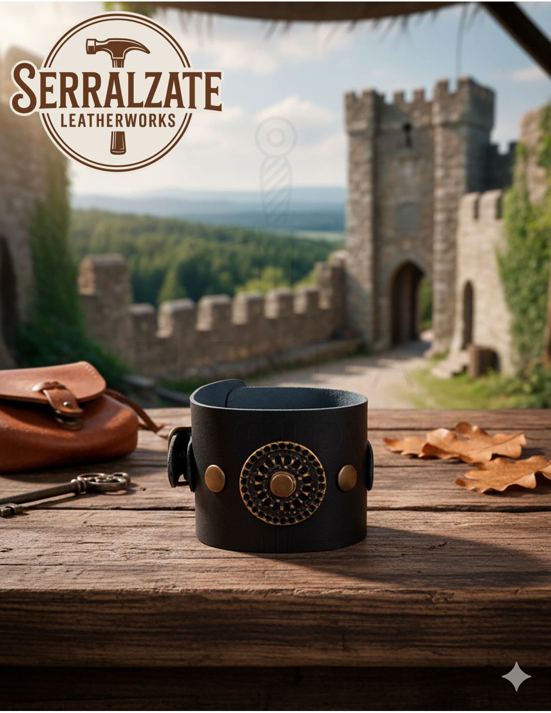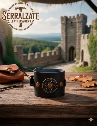 Met de hand gemaakt van hoogwaardige materialen, heeft het brede en stevige ontwerp een centraal cirkelvormig motief, waarvan de ingewikkelde gravure herinneringen oproept aan historische tijden vol mystiek. Bovendien is hij gemakkelijk verstelbaar dankzij de gespsluiting en metalen knopen, waardoor hij comfortabel past op polsomtrekken van 17 tot 25 cm. De ambachtelijke vervaardiging betekent ook dat elk stuk uniek is, met mogelijk kleine variaties in kleur en grootte, wat zijn authenticiteit benadrukt.