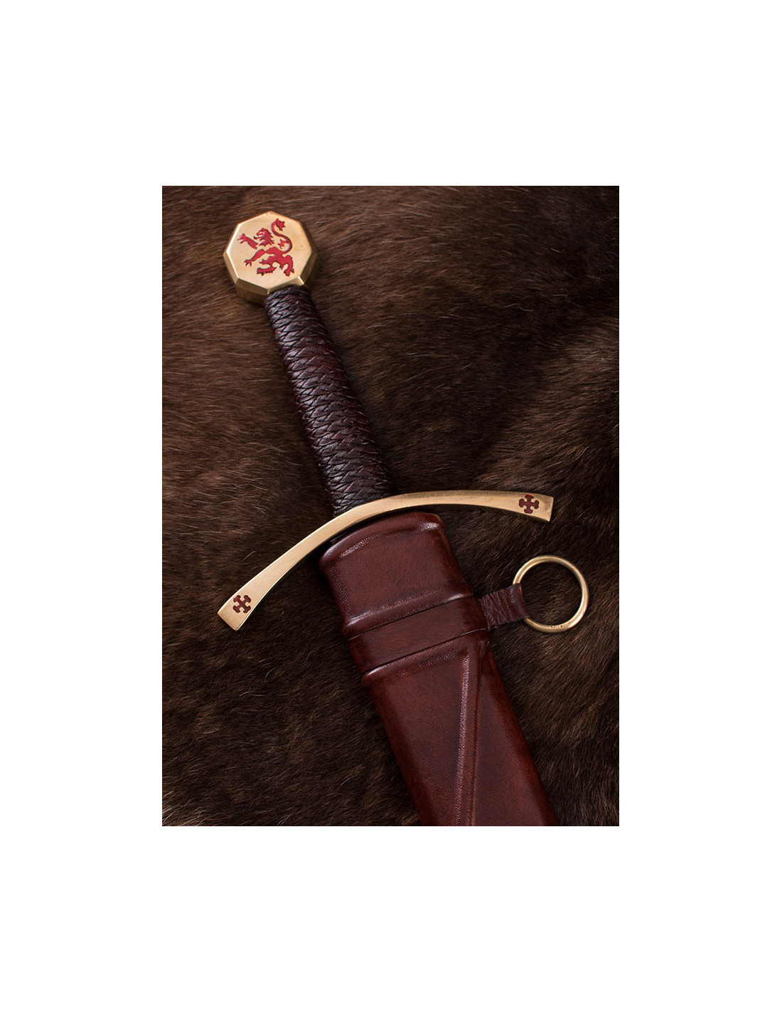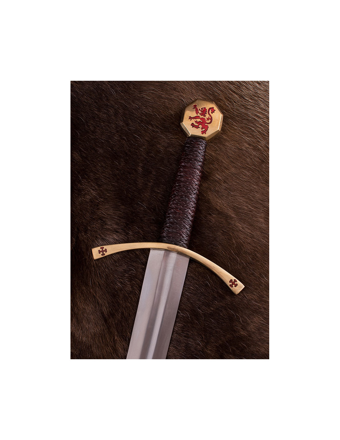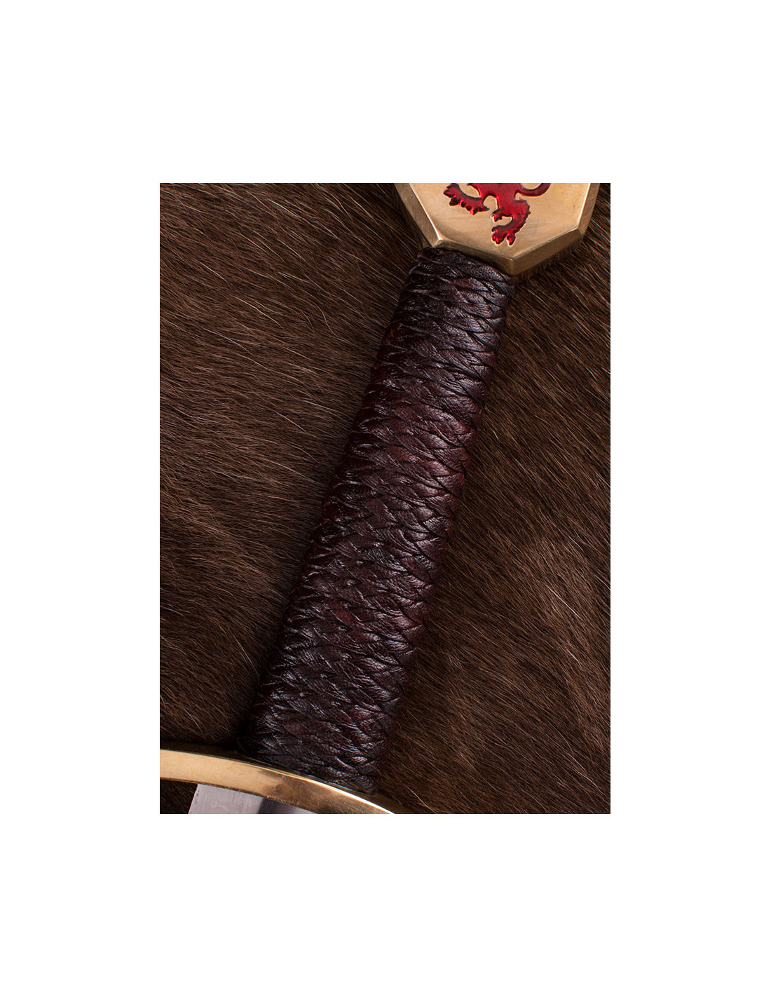 Wil je meer weten over de kenmerken van dit zwaard? Het gewicht is 1,1 kg, waardoor het een handzaam en gemakkelijk te dragen wapen is. De lengte van het blad is 78,5 cm, met een dikte van 4 mm. Het handvat is gemaakt van hout en bedekt met leer, wat zorgt voor een comfortabele en veilige grip. De pareerstang en de achthoekige pommel zijn gemaakt van messing en versierd met de ongebreidelde leeuw en rode kruizen, het karakteristieke schild van Robert I van Schotland.