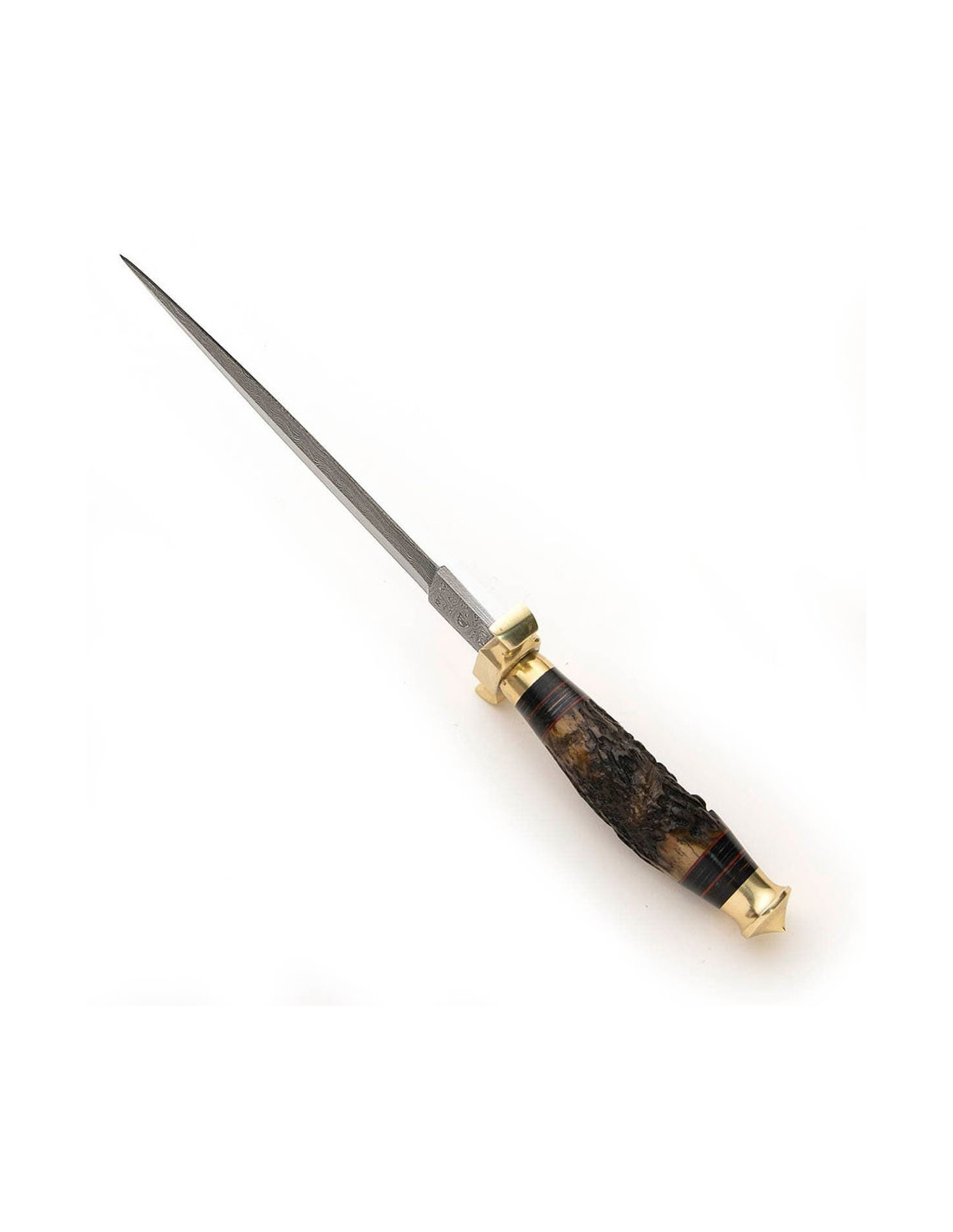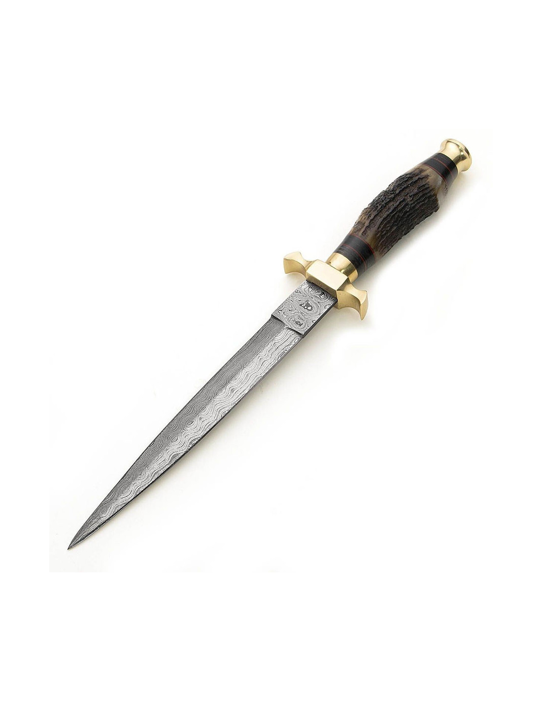 Deze middeleeuwse jachtdolk in Damascus staal is een authentiek juweel dat niet mag ontbreken in de collectie van elke middeleeuwse jager of liefhebber van kwaliteitsproducten. Het indrukwekkende ontwerp omvat een handvat van hertengewei, een massief koperen dwarsstuk en pommel en een strakke zwarte lederen schede.