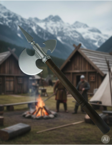 Deze bijl is zorgvuldig verouderd om hem die rustieke en oude look te geven die kenmerkend is voor wapens uit de middeleeuwen. Het houten handvat en het koolstofstalen mes geven het een hoogwaardige afwerking en weerstand.